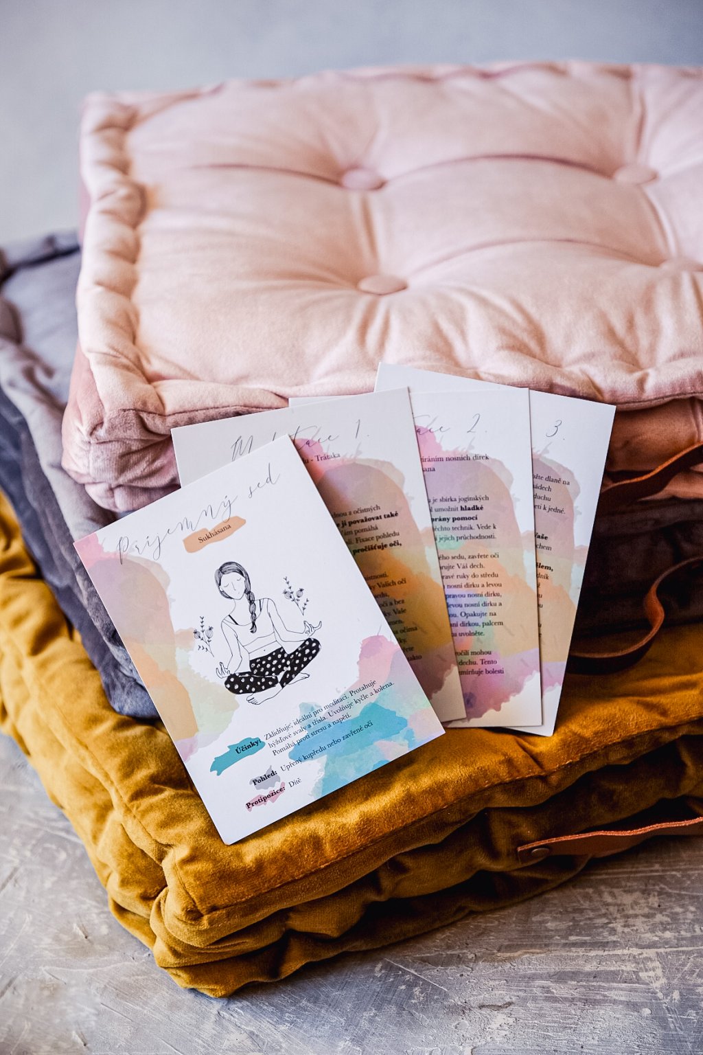 Meditace je v našem životě důležitá, proto dostanete k polštáři sadu tří nádherných kartiček s našimi oblíbenými meditacemi, které jsou jinak součástí našich jógových karet. Katičky jsou navlečené na hedvábném provázku s přívěškem drahého kamene a ozdobeném střapečkem.