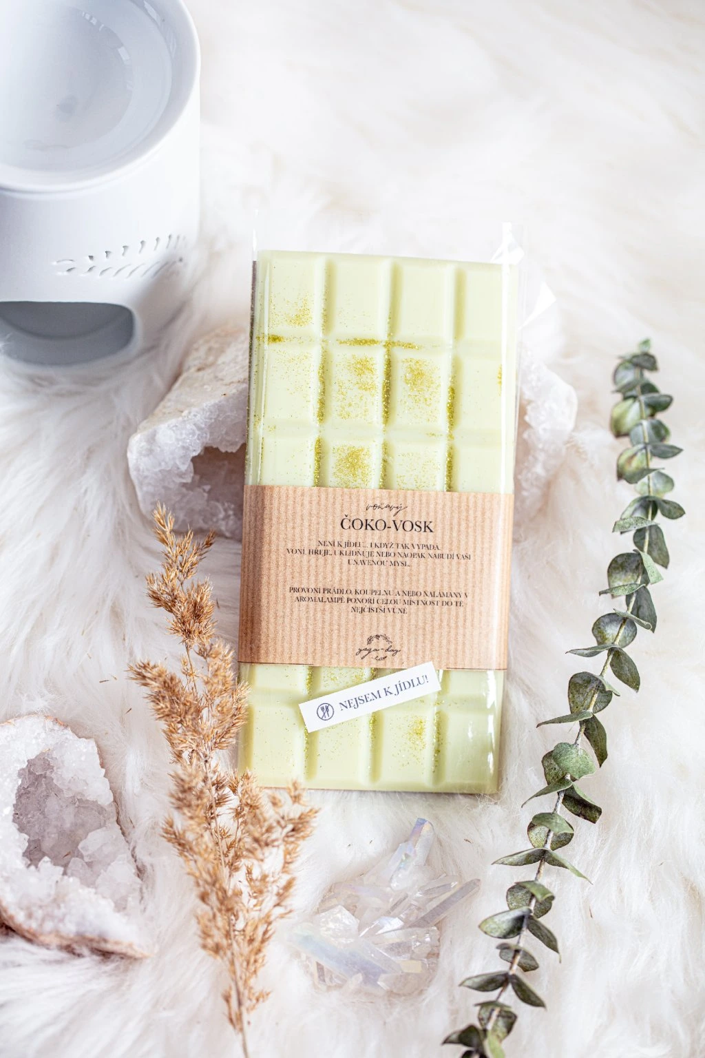 !!! POZOR !!! ČOKO-VOSK není k jídlu, i když je vyroben z přírodního sójového vosku a čistých esenciálních olejů, posypaný biologicky rozložitelnými třpytkami a obarvený přírodními barvivy.