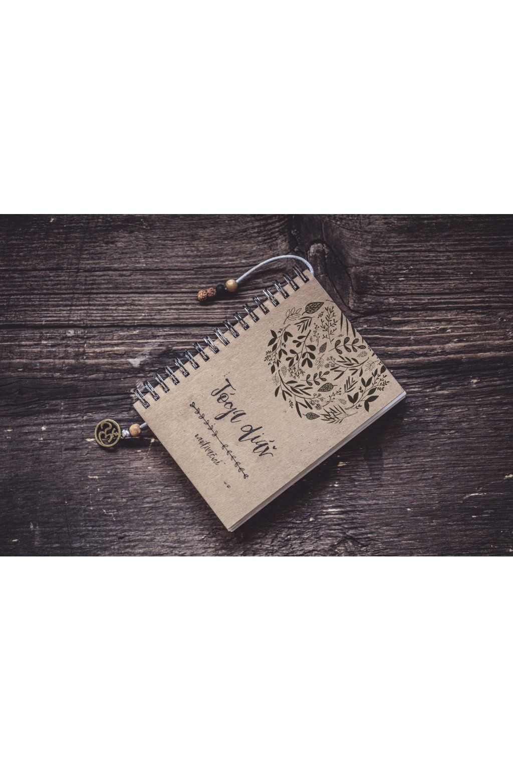 Součástí diáře je designová, ručně vyrobená záložka, ozdobená kovovým přívěskem bez obsahu niklu.