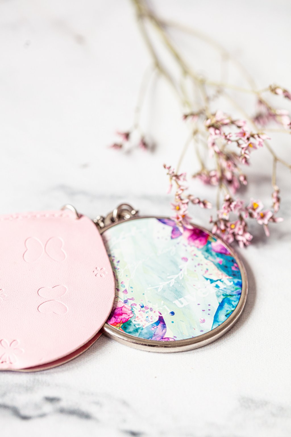 Zrcátko je uložené v krásném růžovém pouzdře na řetízku.