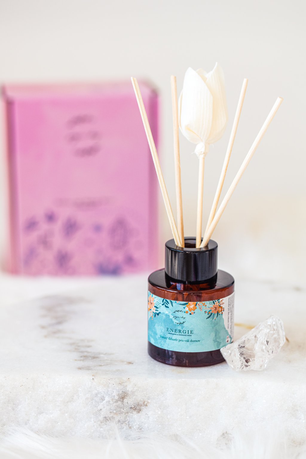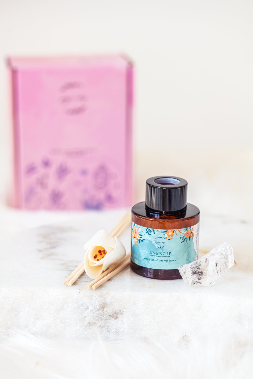 Esenciální oleje jsou součástí našich životů a chceme tvořit krásný domov. Proto jsme stvořili vonné difuzéry, které nejen provoní prostor úžasnou vůní čistých esenciálních olejů, ale zároveň budou něžnou ozdobou vašeho domova. Součástí difuzéru je jeden nádherný květ, který nasaje vůni a jemně ji rozptýlí do prostoru. V balení najdete také surový krystal křišťálu, kámen čistoty a zesílení energie, který projasní prostor, harmonizuje jeho vibrace a podpoří jasnost mysli.