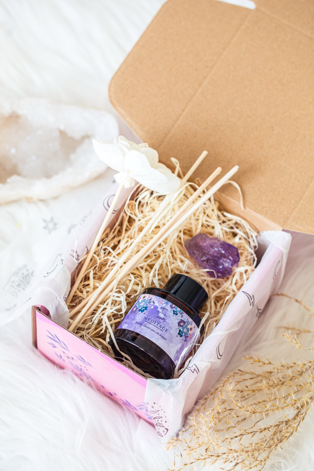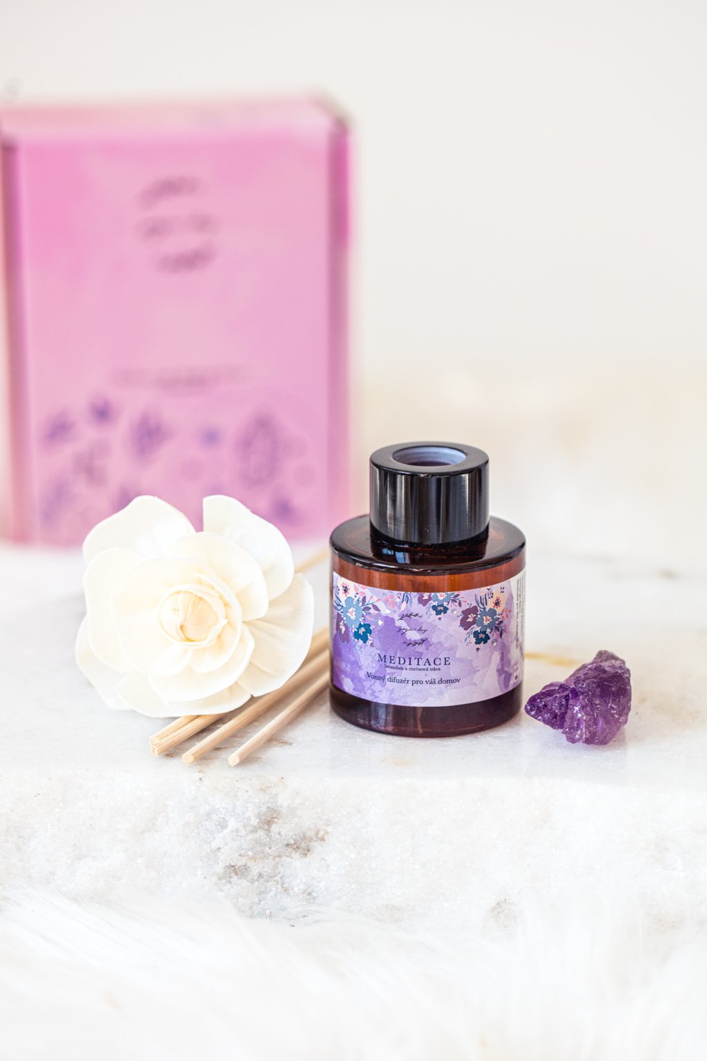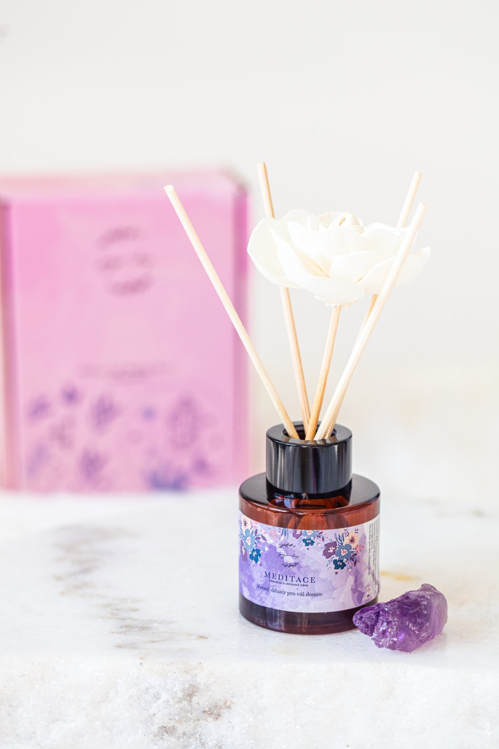 Esenciální oleje jsou součástí našich životů a chceme tvořit krásný domov. Proto jsme stvořili vonné difuzéry, které nejen provoní prostor úžasnou vůní čistých esenciálních olejů, ale zároveň budou něžnou ozdobou vašeho domova. Součástí difuzéru je jeden nádherný květ, který nasaje vůni a jemně ji rozptýlí do prostoru. V balení najdete také surový krystal ametystu, kámen duchovní ochrany a intuice, který zklidní energii prostoru, podpoří meditaci a přinese hlubší vnitřní rovnováhu.