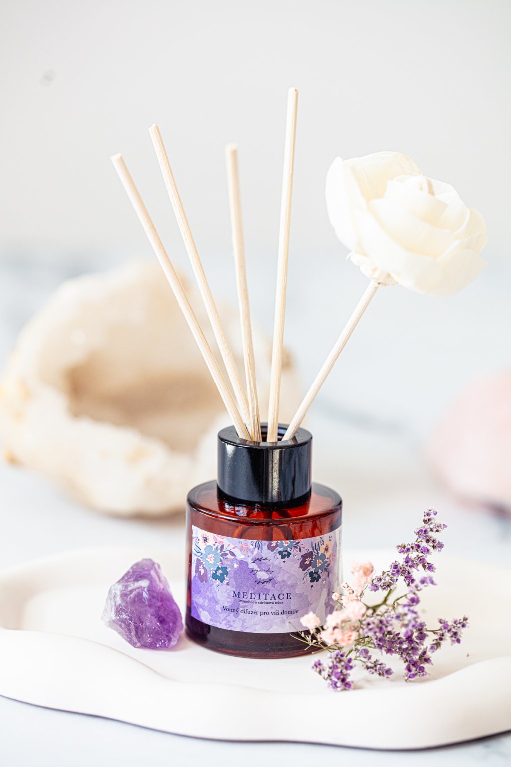 Vonný difuzér Meditace obsahuje vůně levandule a citrónové trávy, které ztiší a zpomalí vaše myšlenky, uleví od stresu a podpoří hluboké zklidnění.