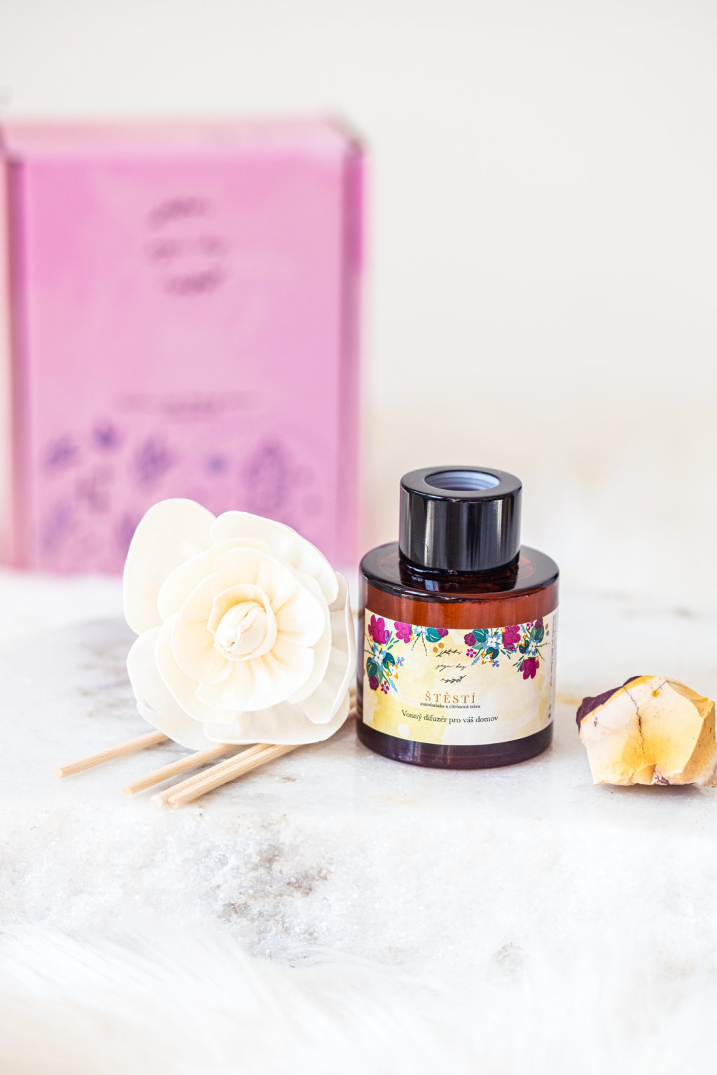 Esenciální oleje jsou součástí našich životů a chceme tvořit krásný domov. Proto jsme stvořili vonné difuzéry, které nejen provoní prostor úžasnou vůní čistých esenciálních olejů, ale zároveň budou něžnou ozdobou vašeho domova. Součástí difuzéru je jeden nádherný květ, který nasaje vůni a jemně ji rozptýlí do prostoru. V balení najdete také surový krystal mokaitu, kámen stability a životní síly, který uzemní energii prostoru, podpoří odvahu ke změnám a přinese pocit jistoty a rovnováhy.