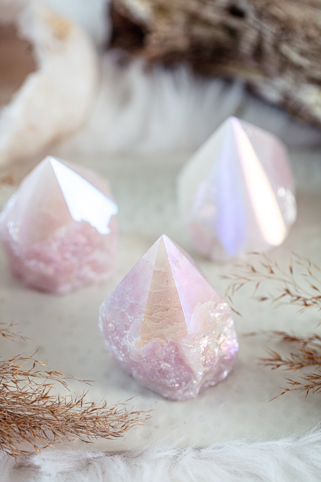 Aura obsahuje silné a láskyplné energie. Nese vlastnosti růžového křemene a platiny, která je s ní spojena, aby získala její duhovou barvu.