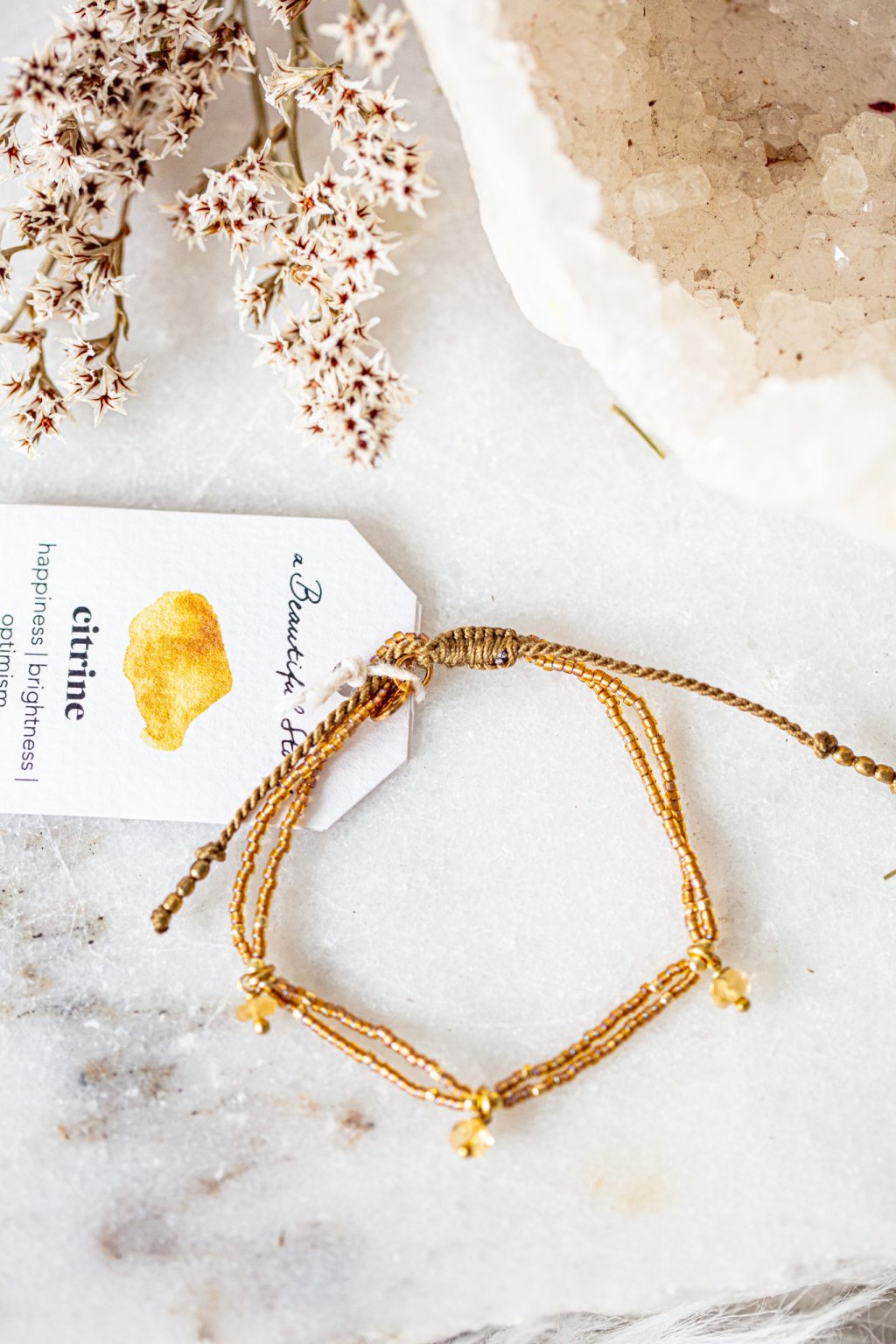 Elegantní šňůrkový náramek z jemných korálků a zářivých kousků citrínu přináší do vašeho dne teplo slunce a radostný třpyt. Je lehký, hravý a přesto působí velmi výrazně, jako malé světlo, které nosíte přímo na zápěstí.