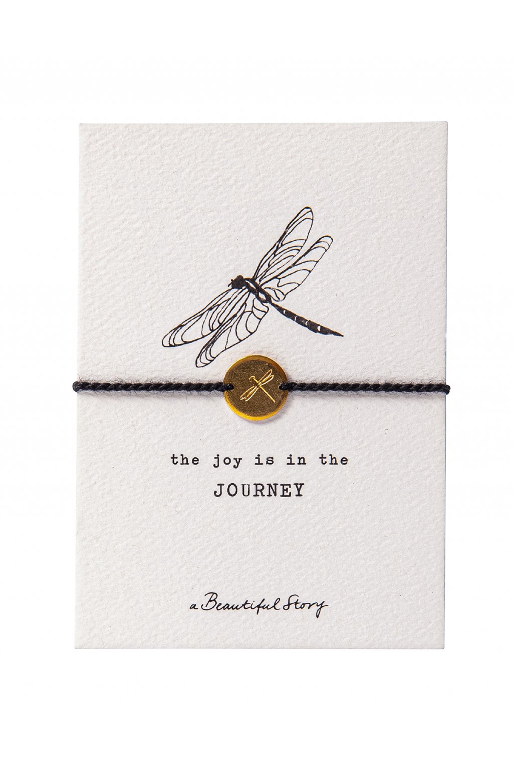 Náramek je ručně vyrobený z bavlněné nitě a je na něm mince se symbolem vážky z pozlacené mosazi. Na přání je krásná černobílá ilustrace vážky s nápisem, který říká „radost je na cestě“.