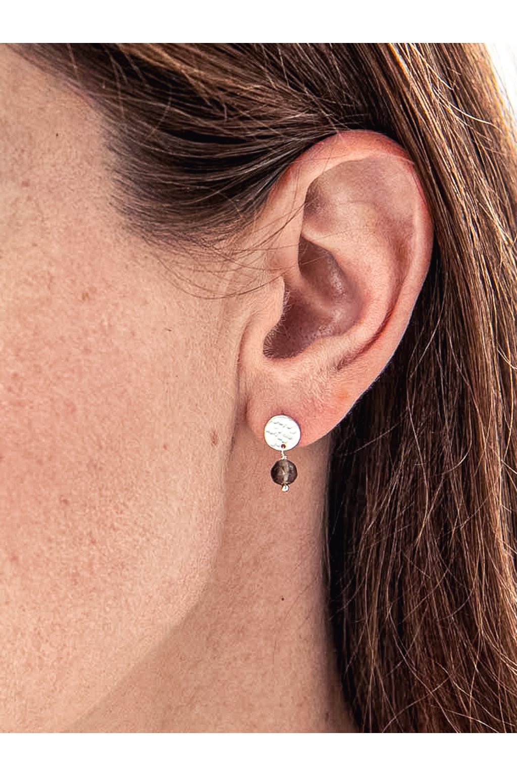 Tyto náušnice s nepravidelně opracovanou placičkou jsou dlouhé 1,5 centimetru. Vypadají jako stříbrná mince s malým kouřovým křišťálem.
