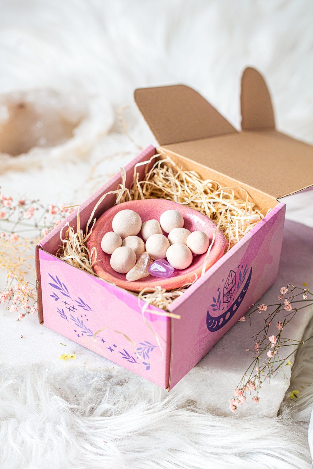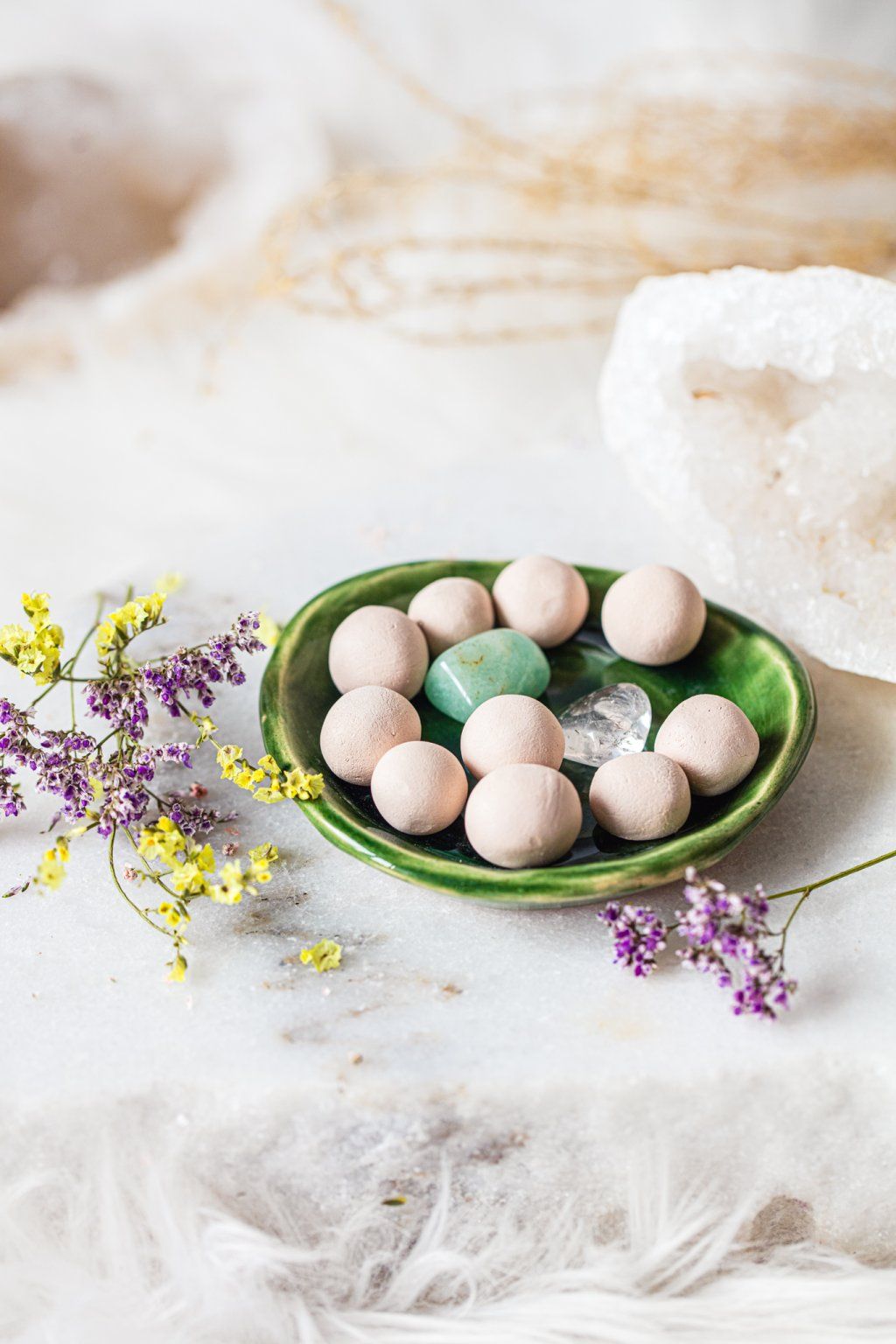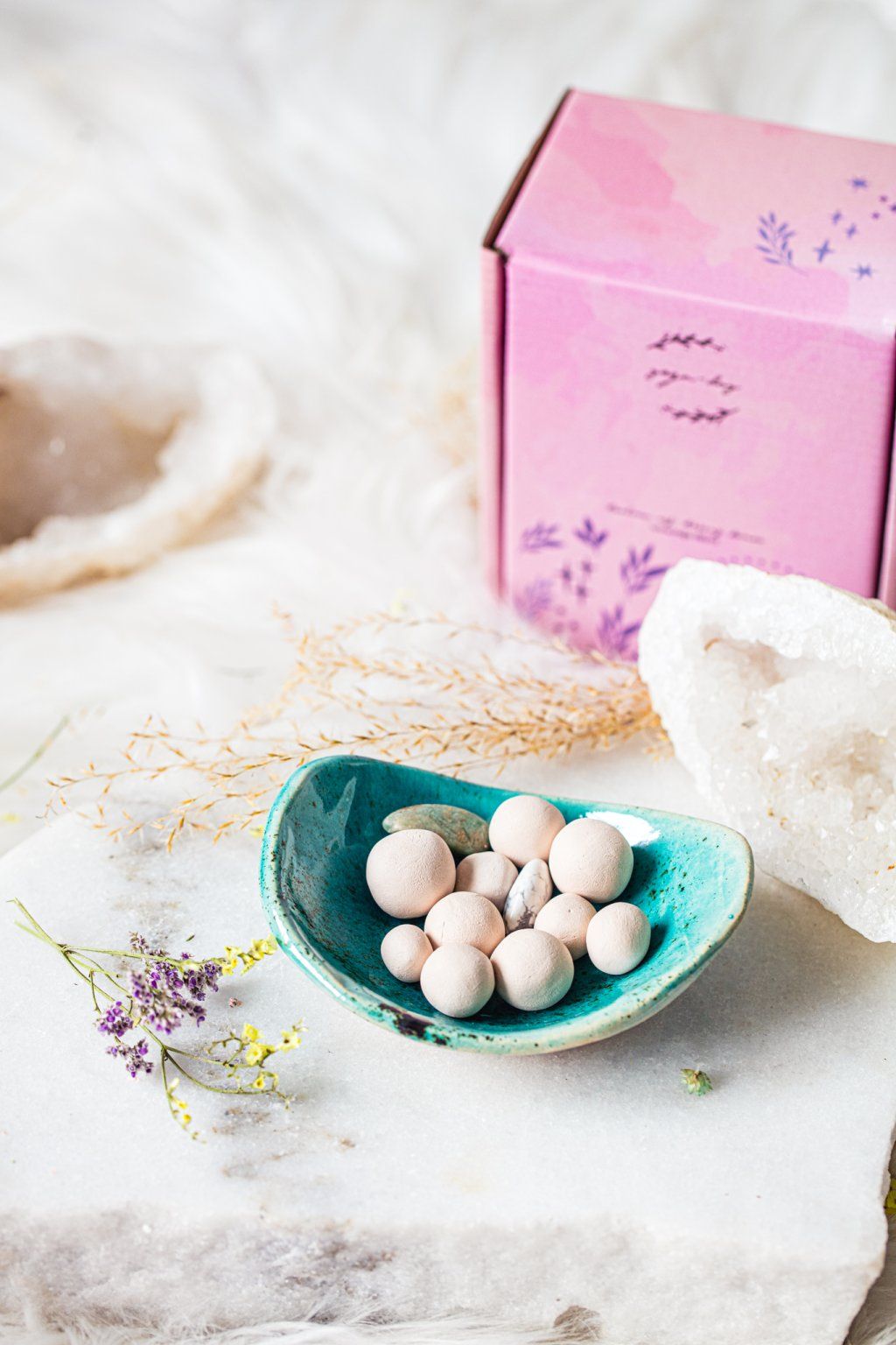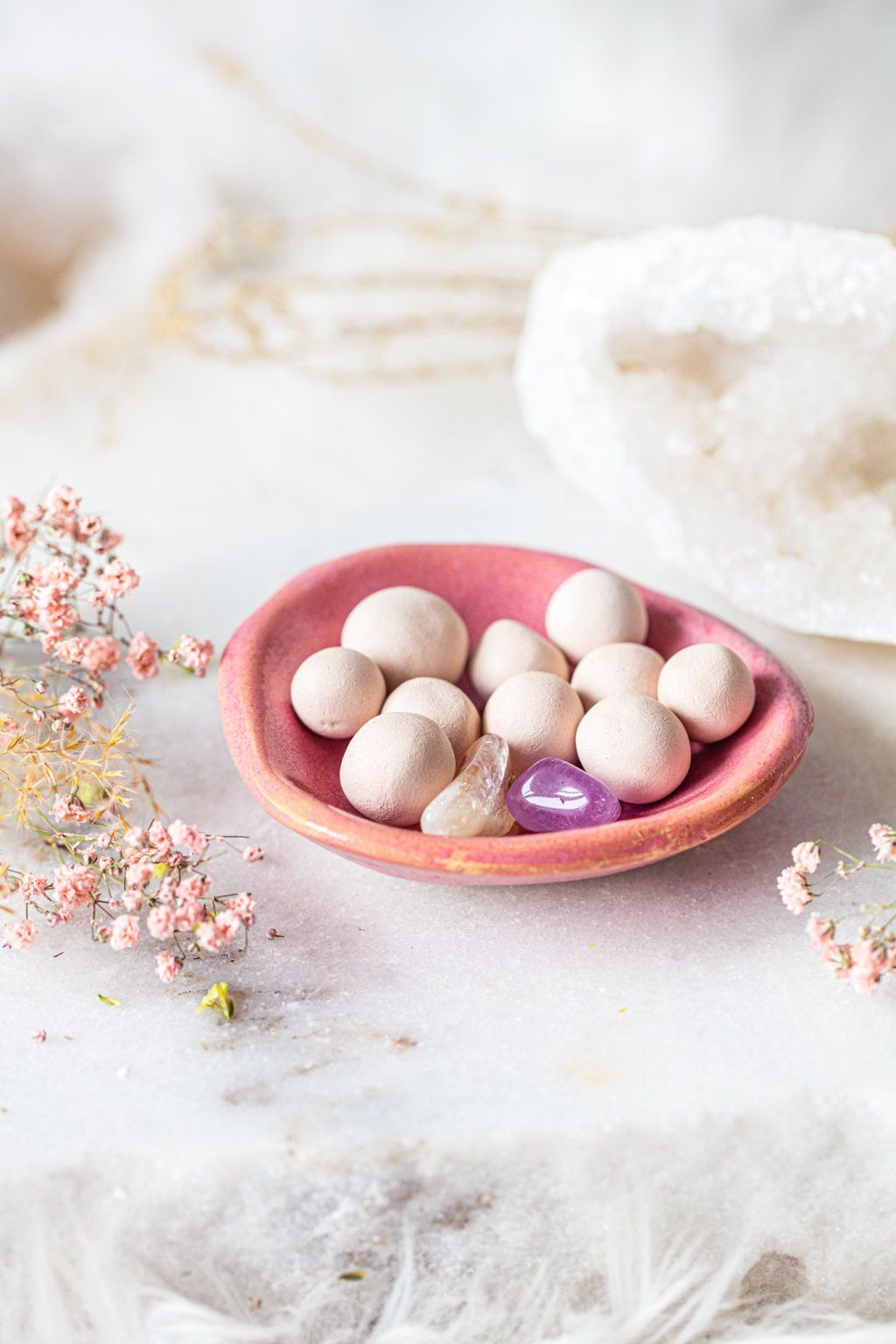 Stačí pár kapek vašeho oblíbeného esenciálního oleje na keramické kuličky a během chvilky se prostor naplní jemnou, příjemnou vůní. Součástí každé varianty jsou pečlivě vybrané krystaly, které podporují pozitivní energii, klid a pohodu.