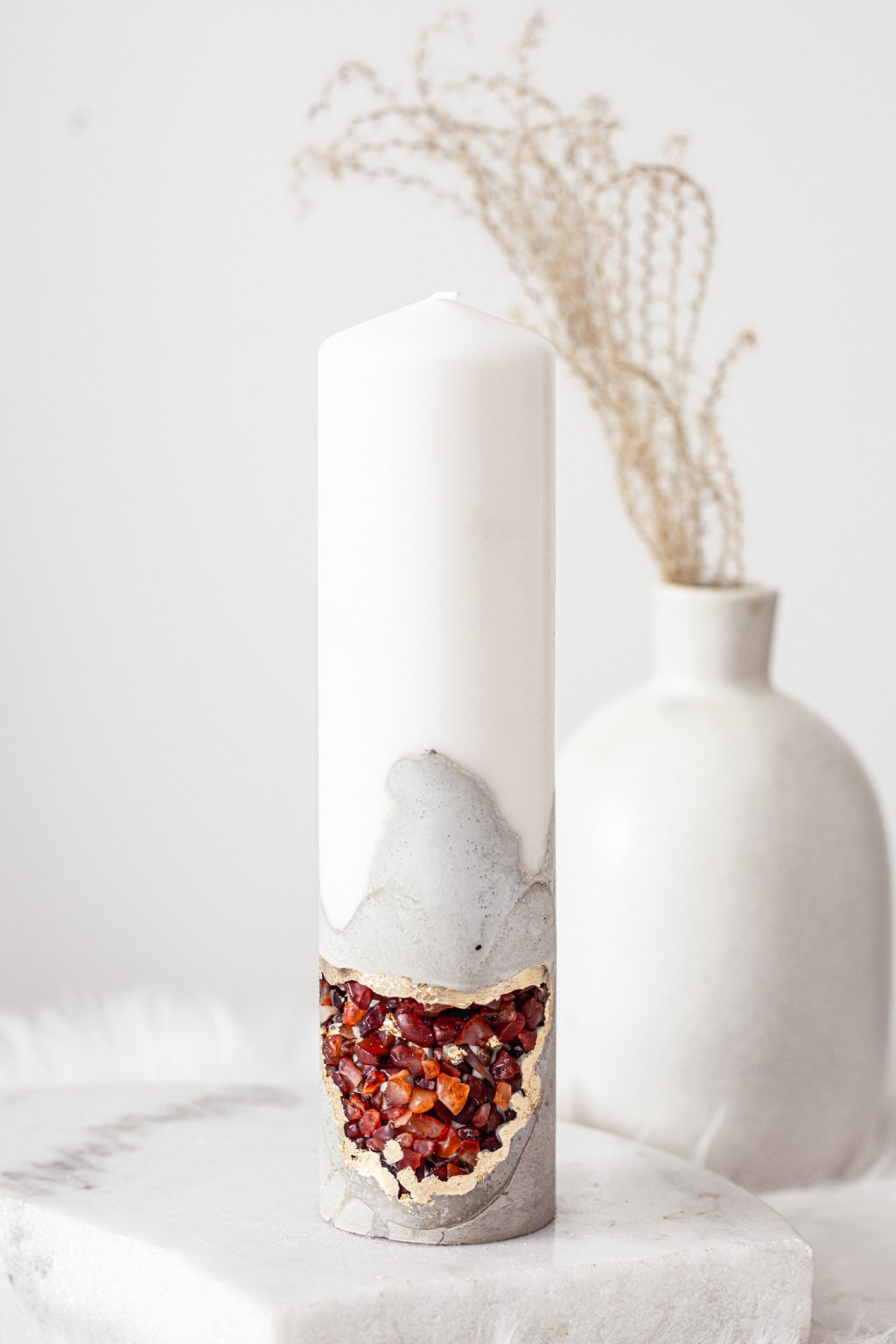 Luxusní svíčka s nádhernou ručně vyrobenou základnou z betonu, která je obohacena o krystaly karneolu s akcentem zlaté barvy.