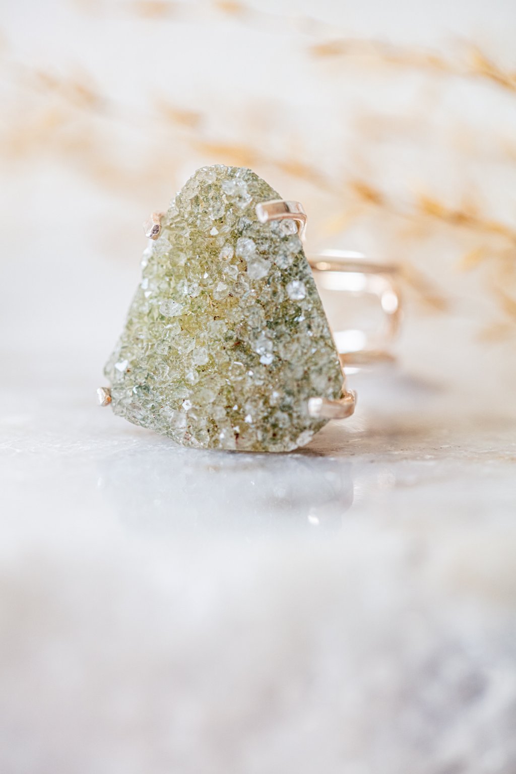 Prsten s drúzou křemene je každý jiný, vyberte si ten pravý pro vás! Drúza je úžasné seskupení srostlých krystalů na společném podkladu. Tyto trsy v sobě shromažďují ohromnou energii, odsávají negativní energii a proměňují ji v pozitivní. Drúzy jsou energeticky velmi silné a hodí se na ochranu větších prostor - nemusíte se je nosit bát do větší společnosti, na konference apod. Pomohou vám potlačit pocity trémy neboť vyzařují energii do okolního prostředí.