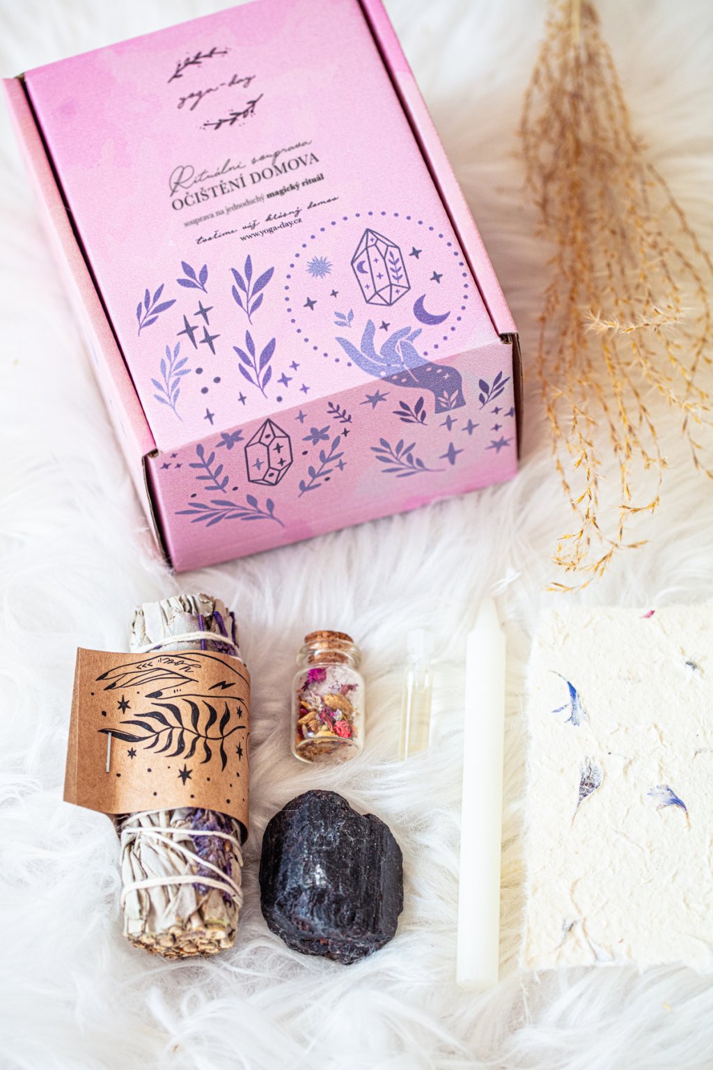 Rituální souprava Očištění domova obsahuje: vykuřovadlo bílá šalvěj s levandulí, krystal surového černého turmalínu, bílou svíčku, bylinky a sůl pro očištění domova, esenciální olej.
