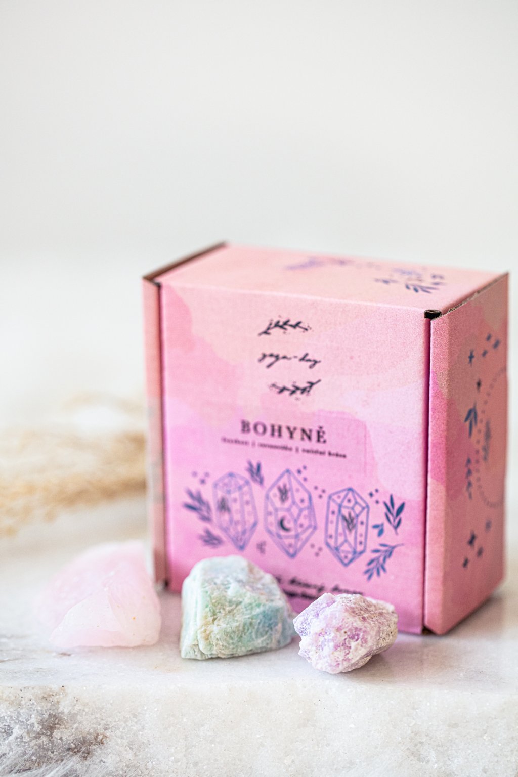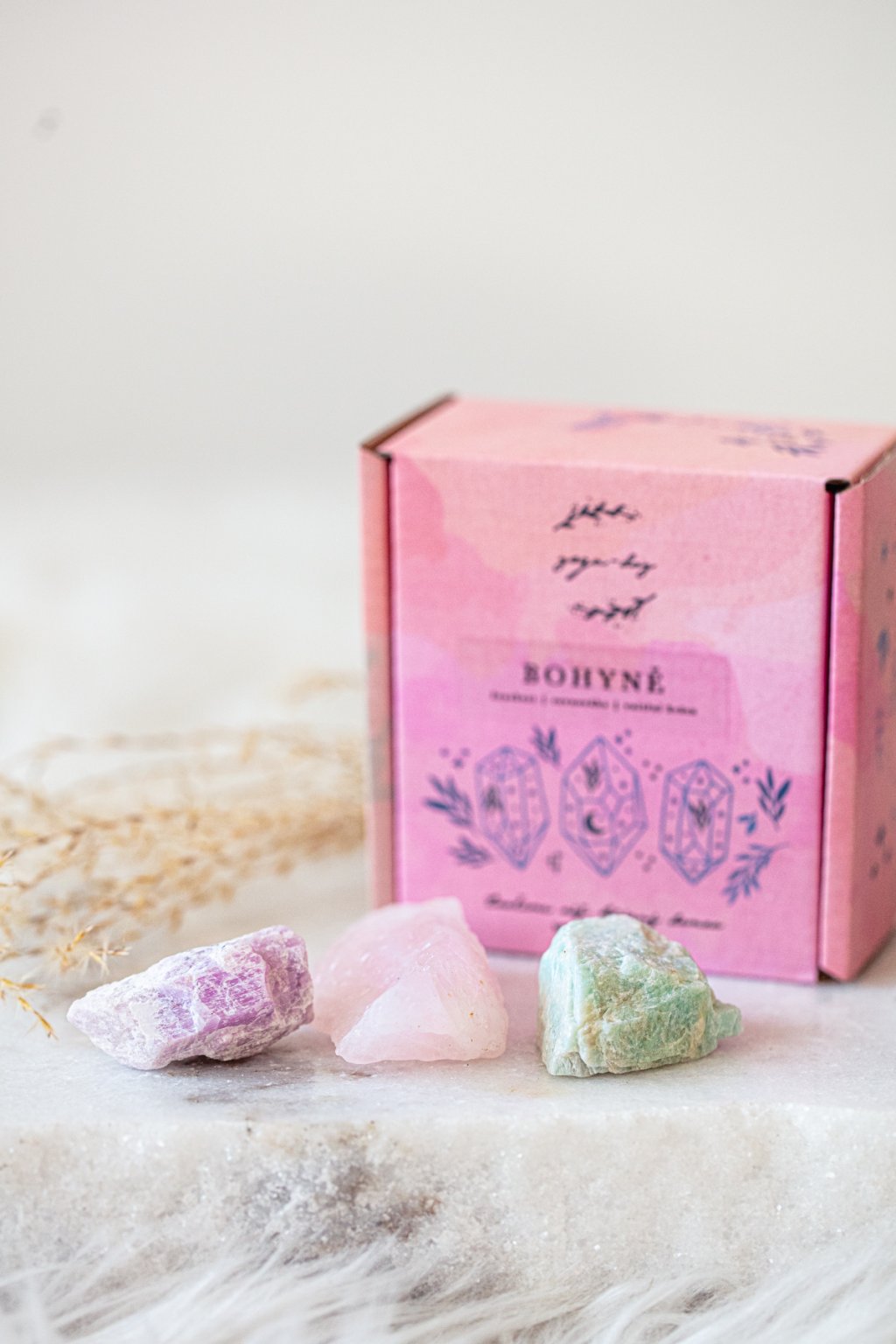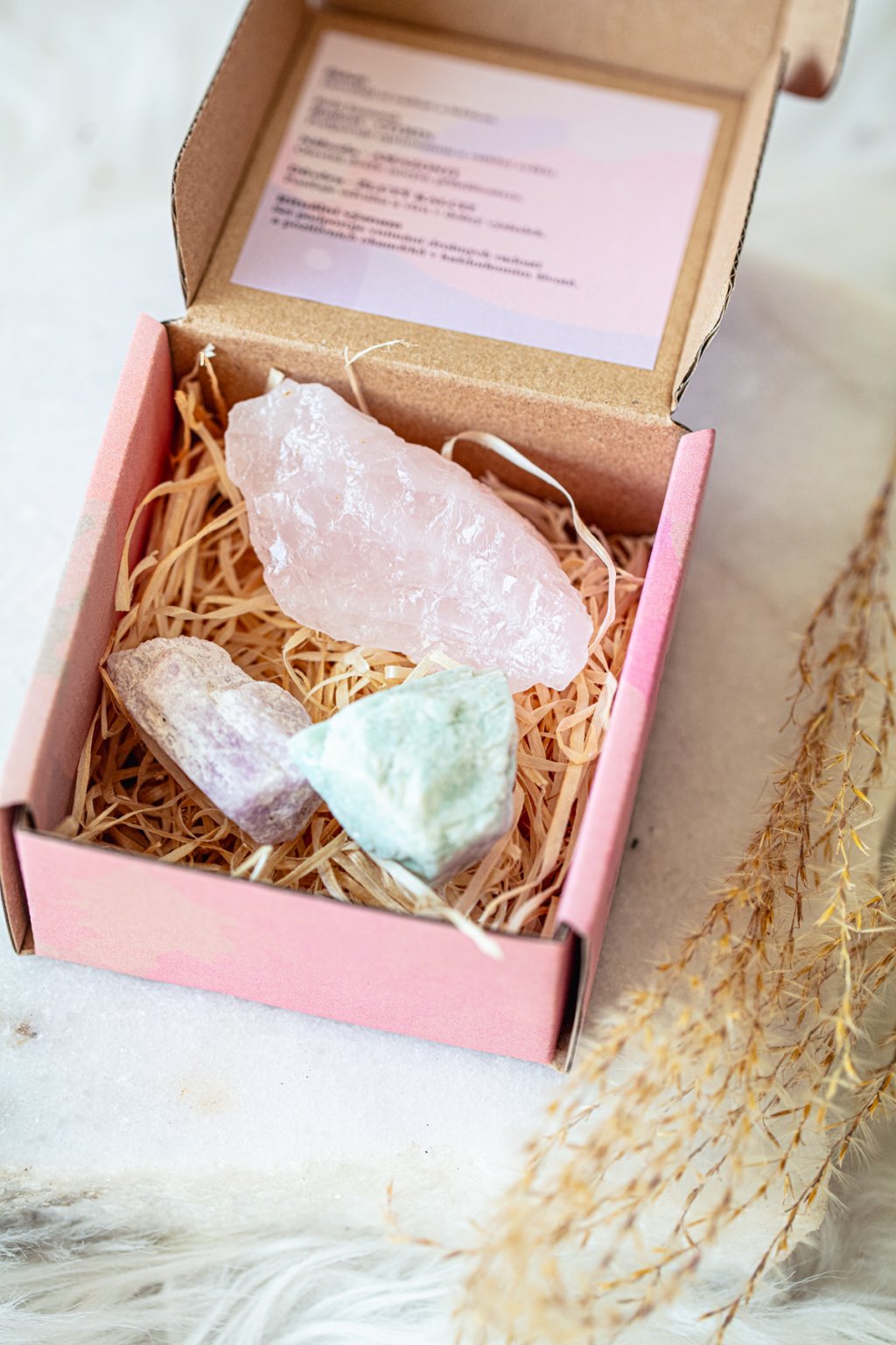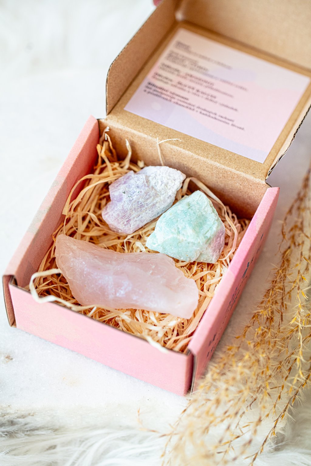 V nádherné krabičce o velikosti 9x9x5 cm naleznete surové kusy růženínu, kunzitu a amazonitu.