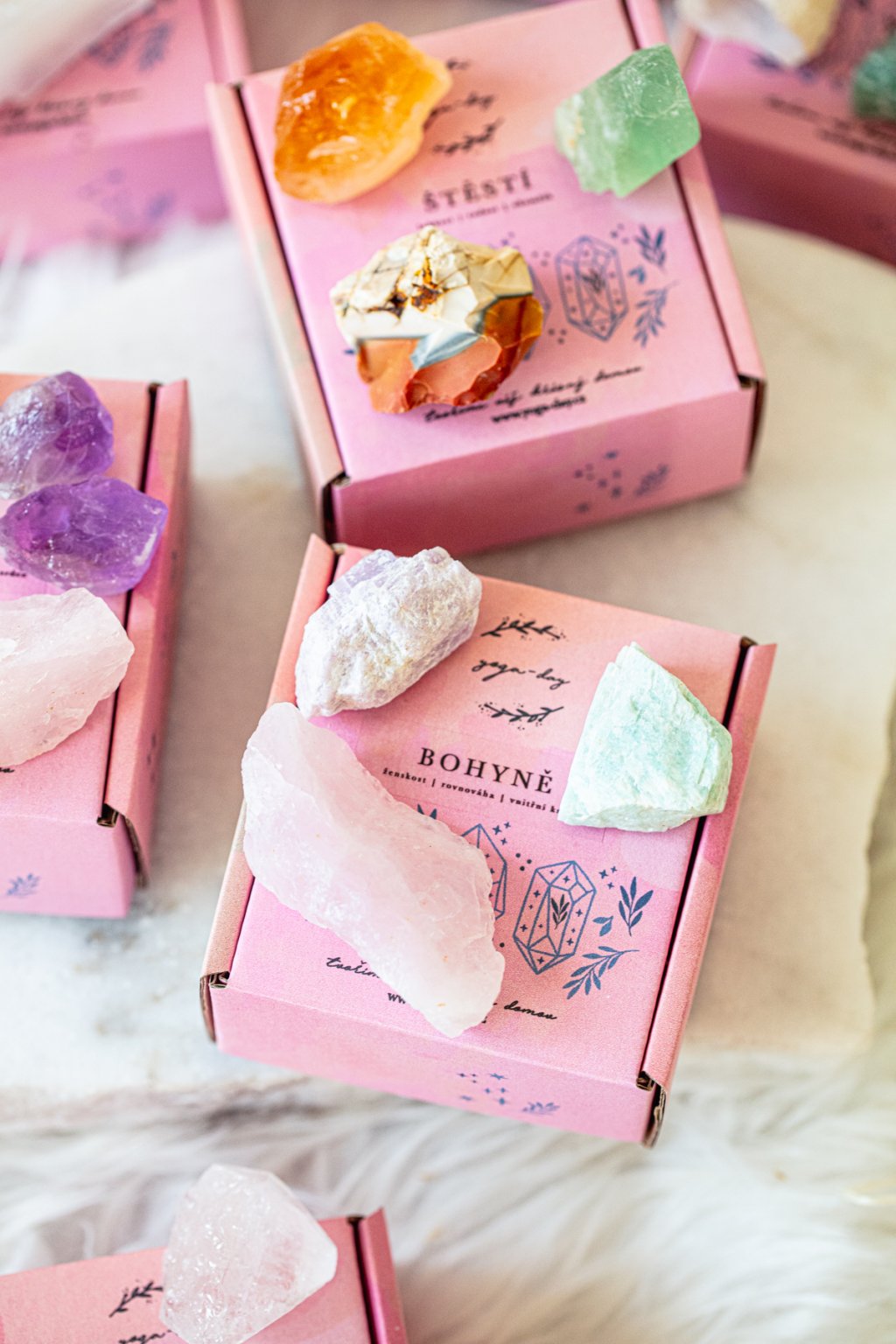 Uložené jsou v nádherné dárkové yoga-day krabičce, aby bezpečně doputovaly až k vám. Uvnitř krabičky je popis energie krystalů a jejich role.
