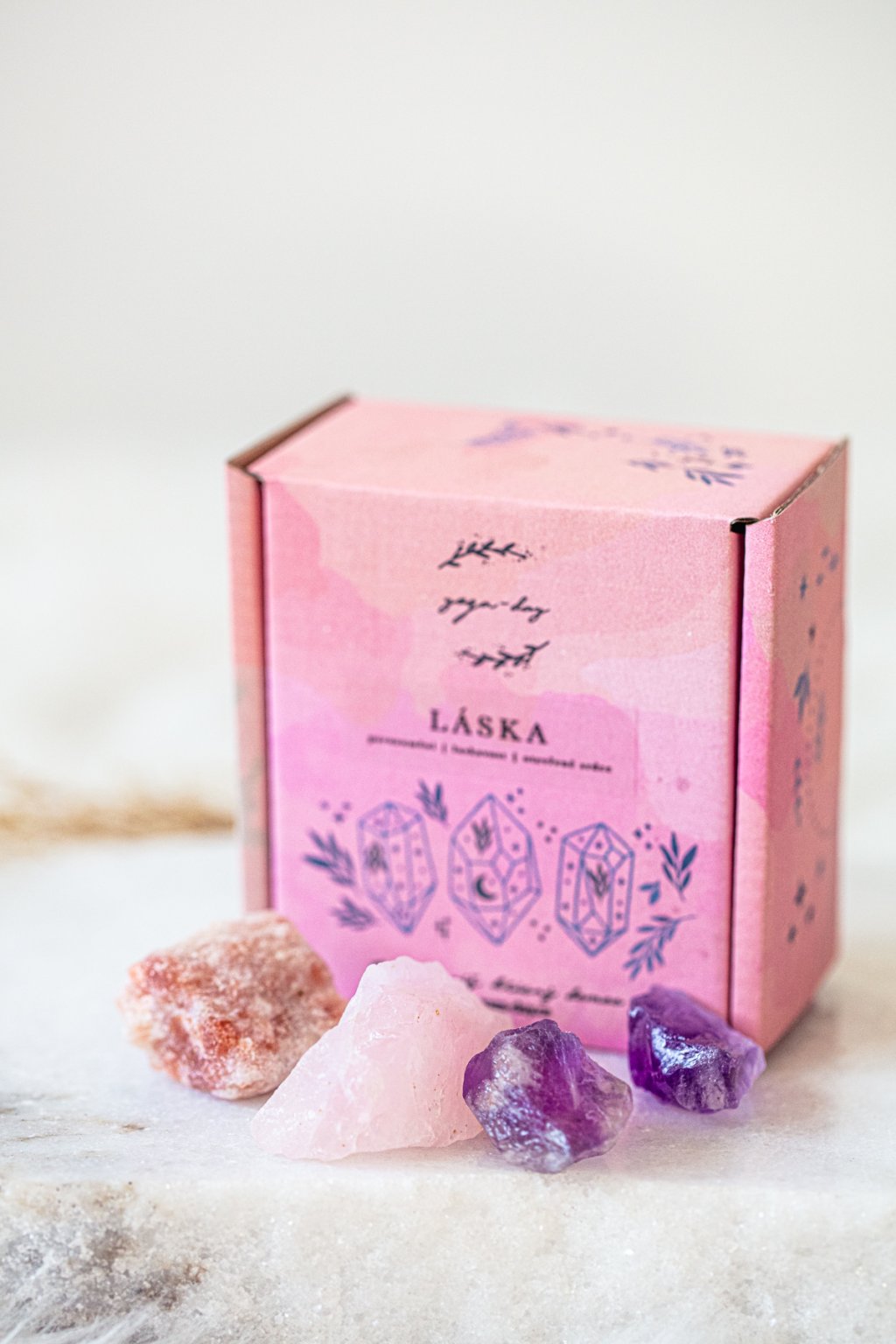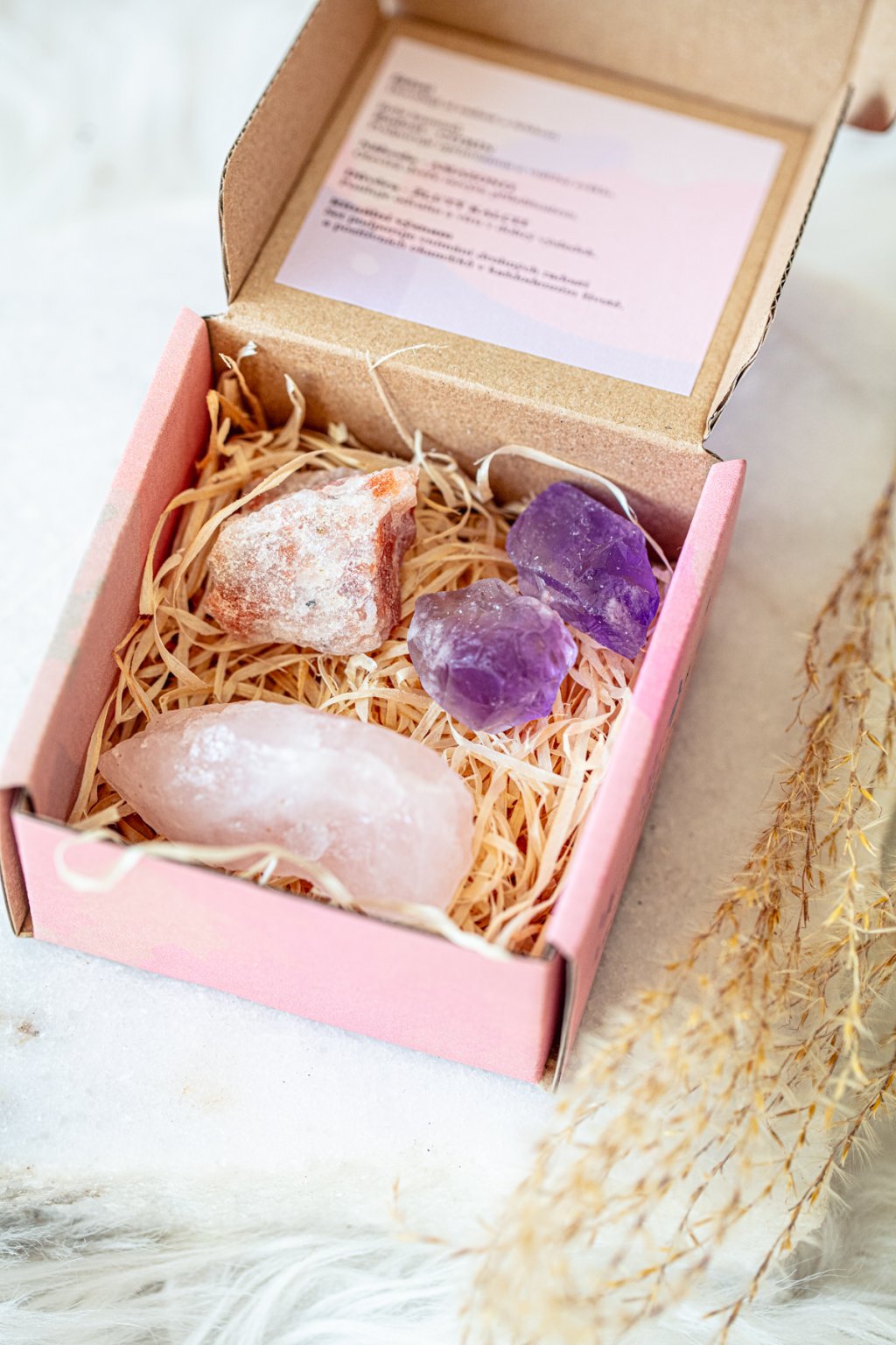 V nádherné krabičce o velikosti 9x9x5 cm naleznete surové kusy růženínu, měsíčního kamene a ametystu.