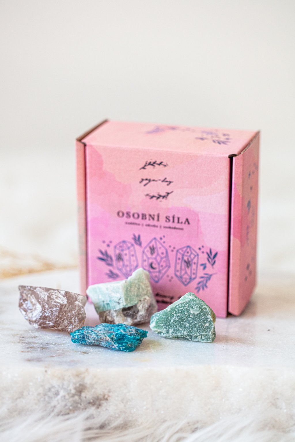 V nádherné krabičce o velikosti 9x9x5 cm naleznete surové kusy amazonitu, kouřového křišťálu, apatitu a avanturínu.
