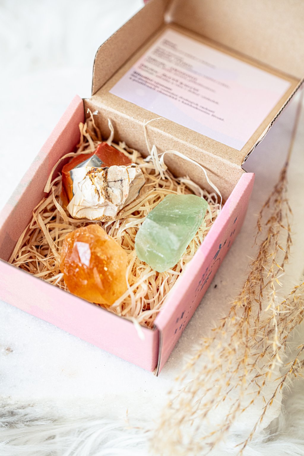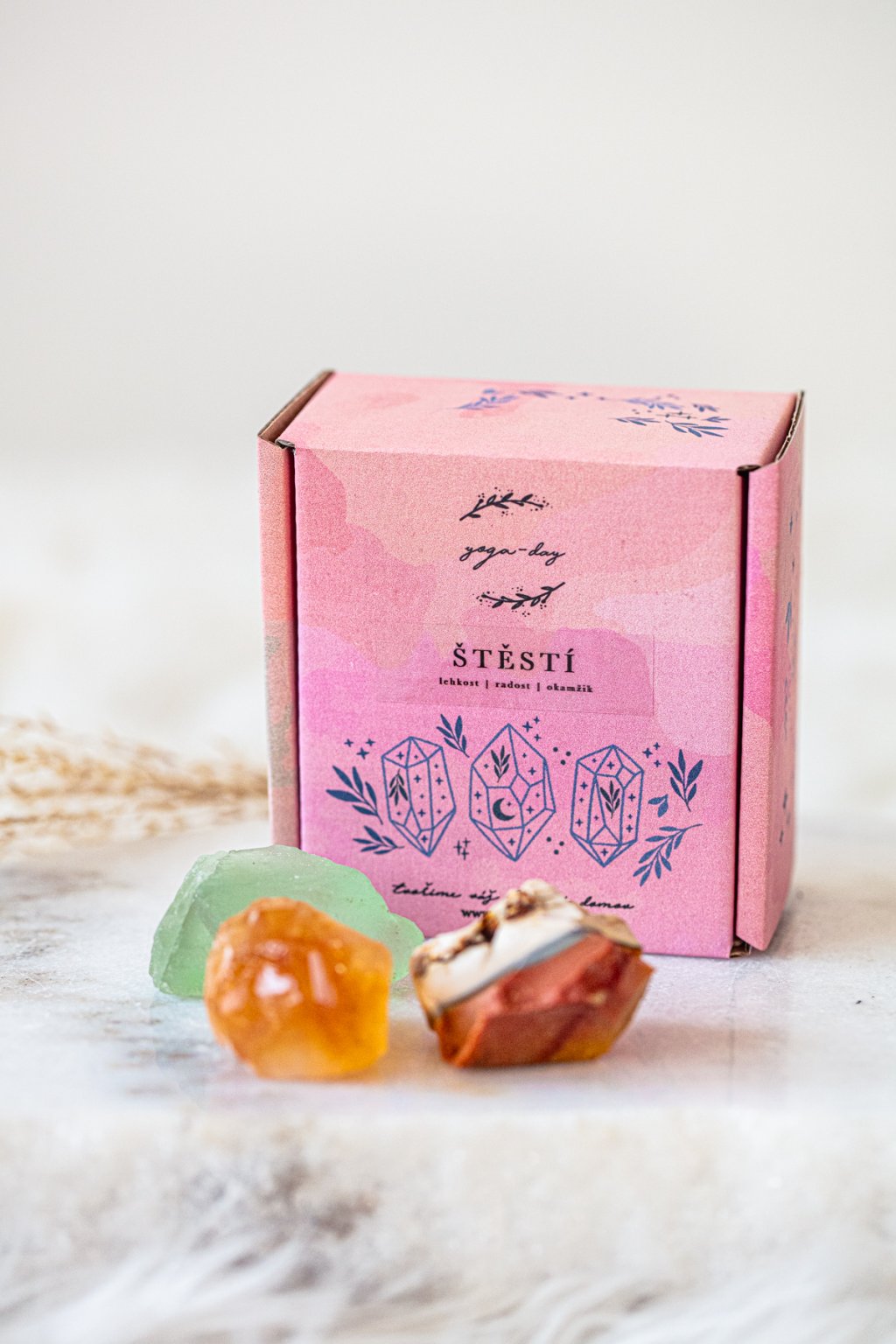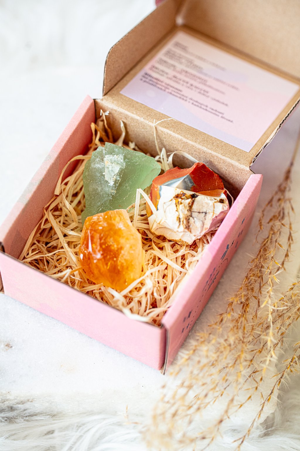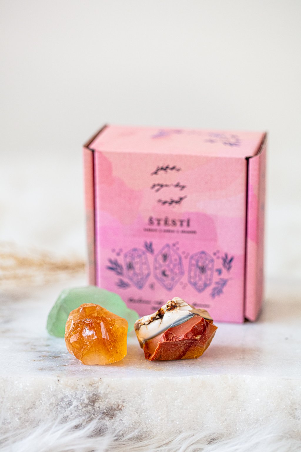 V nádherné krabičce o velikosti 9x9x5 cm naleznete surové kusy citrínu, fluoritu a mokaitu.