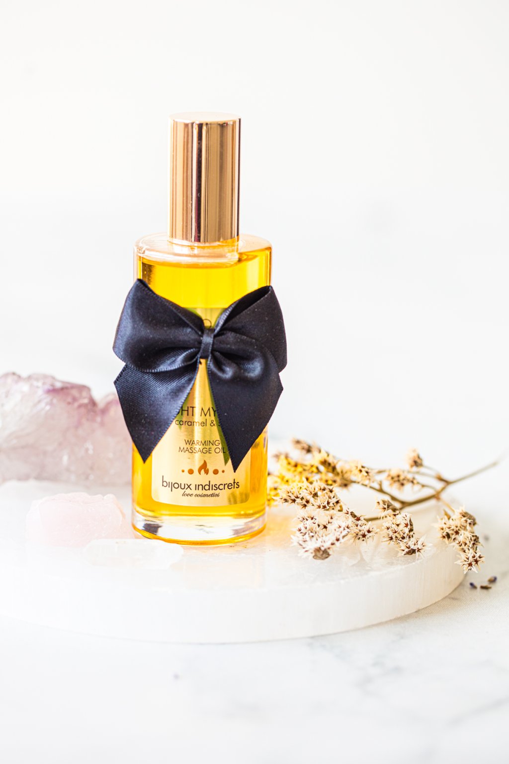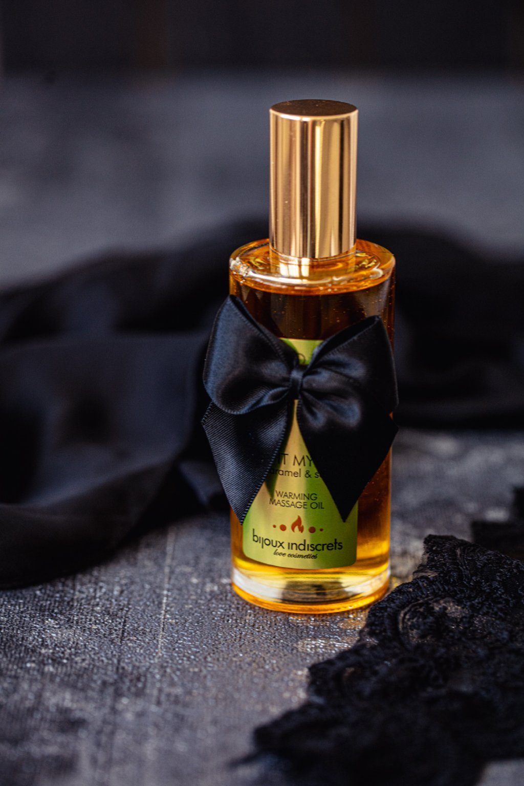Elegantní lahvička ozdobená saténovou mašlí podtrhuje luxusní charakter tohoto oleje. Je připravena stát se klíčem k večeru plnému vášně, chuti a vědomého propojení.