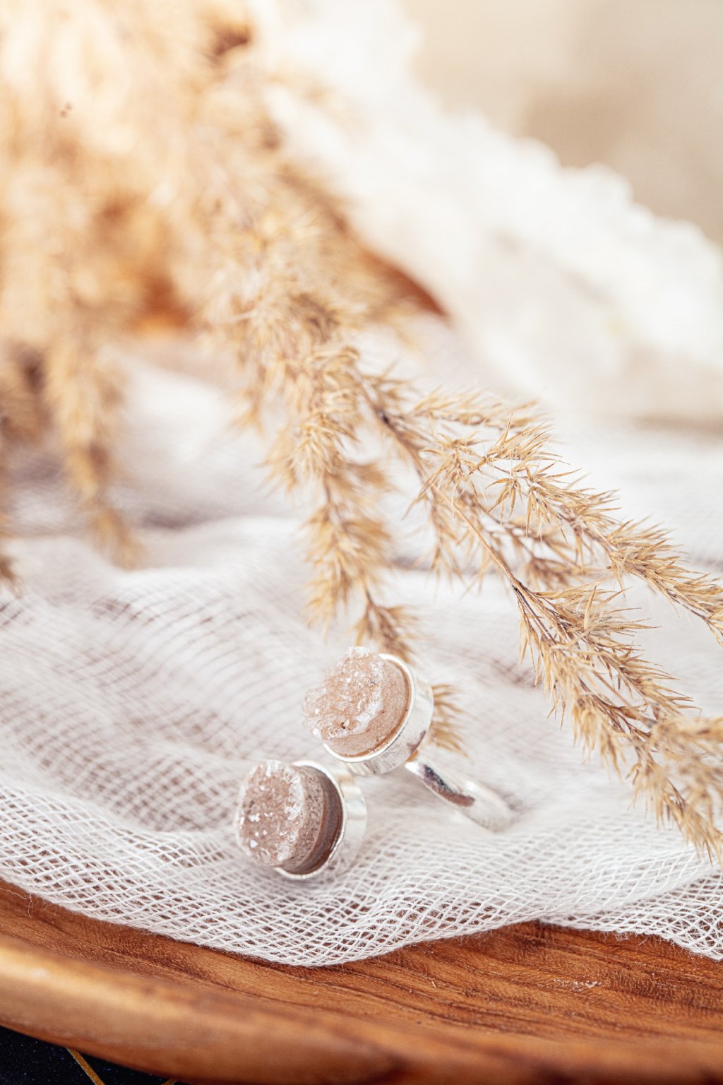 Prsten obsahuje dvě něžné, světlé drúzičky zasazené do kulaté postříbřené základny. Každá drúzička má průměr 1cm.