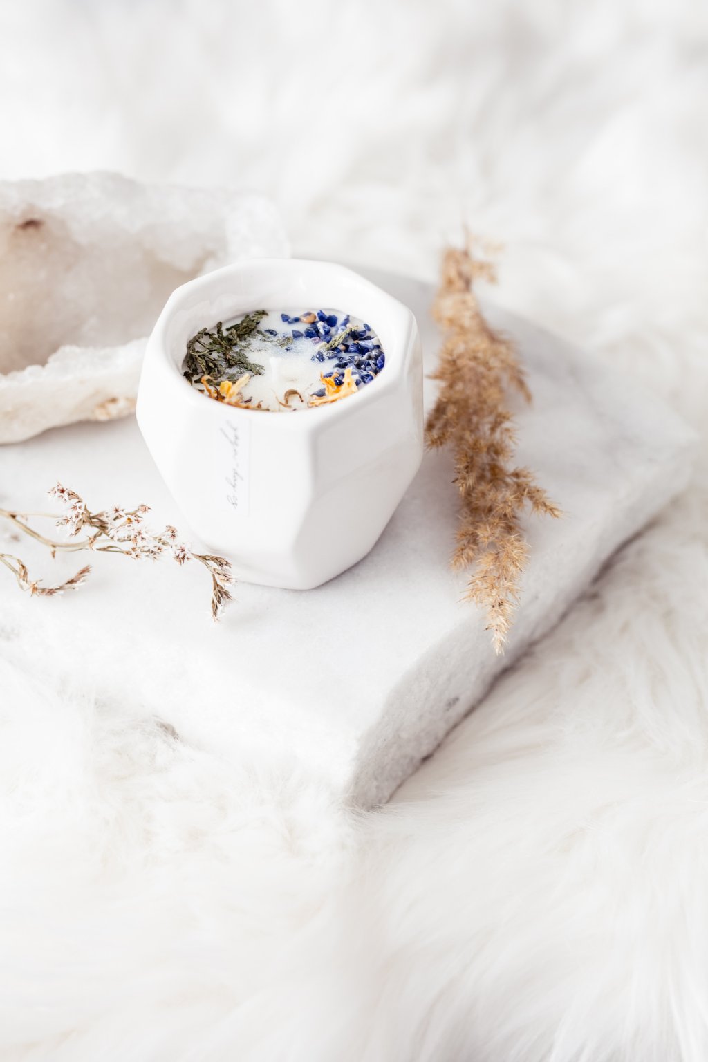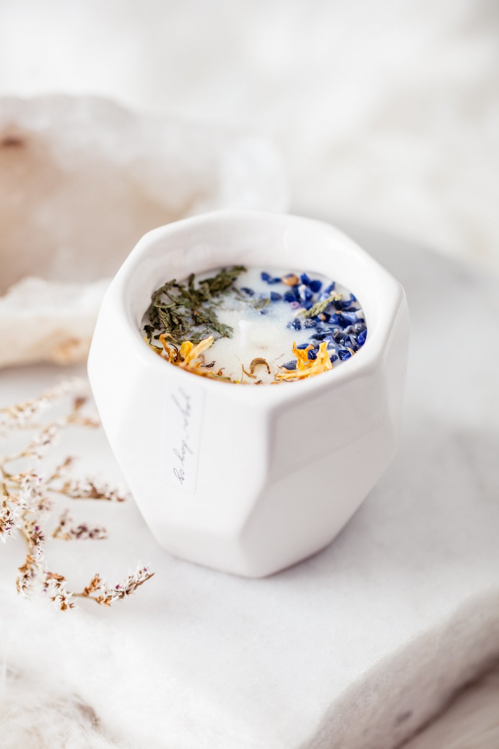 Svíčka je ozdobená ekologickými třpytkami, bylinkami a sodalitem.