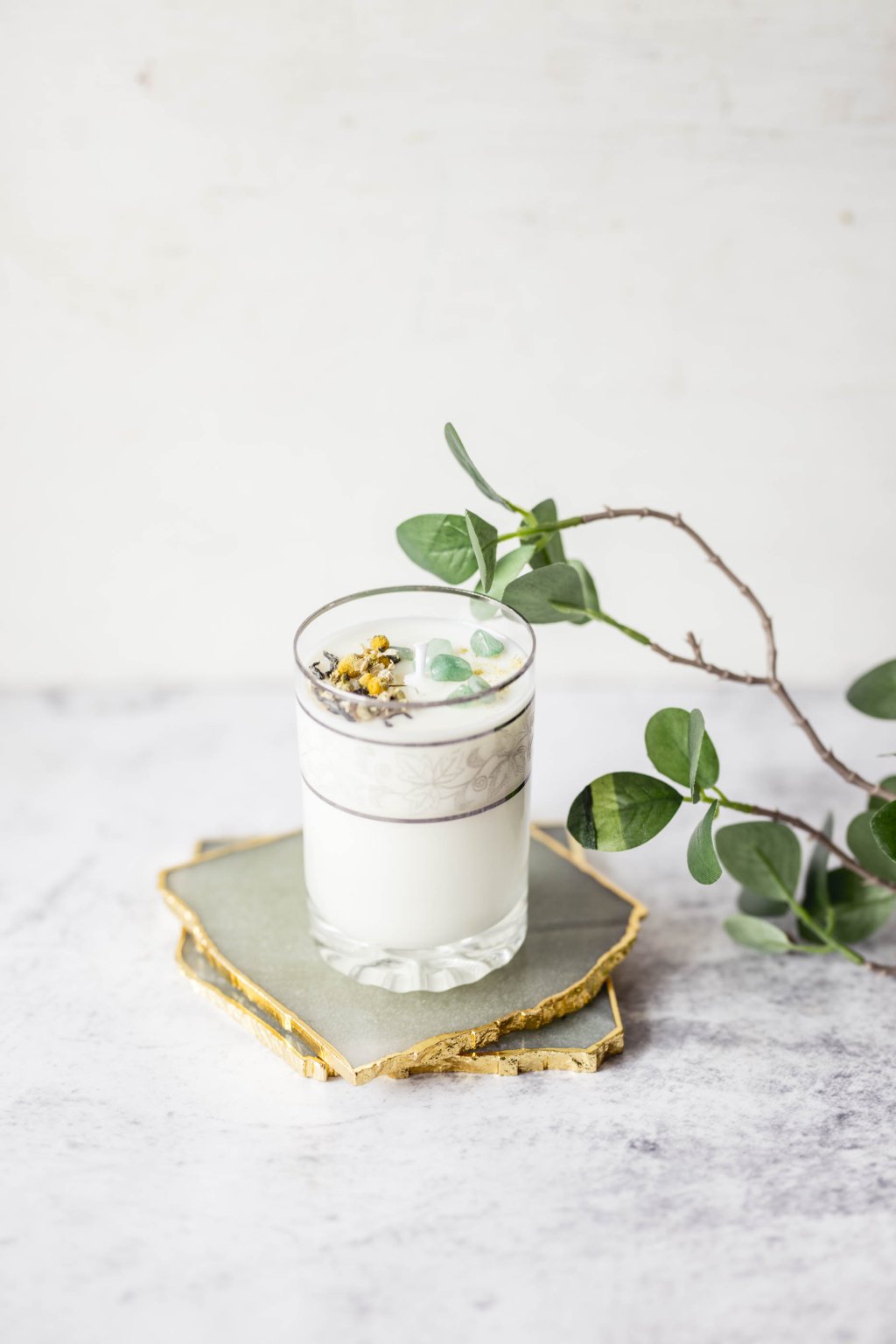 Každou svíčku jsem ozdobila květy heřmánku a lísky zeleného čaje. Krystalky aventurínu pomáhají domácnosti k prosperitě, vnáší do domova klid a pohodu. Používá se k ochraně domů a účinně chrání před geopatogenními zónami.
