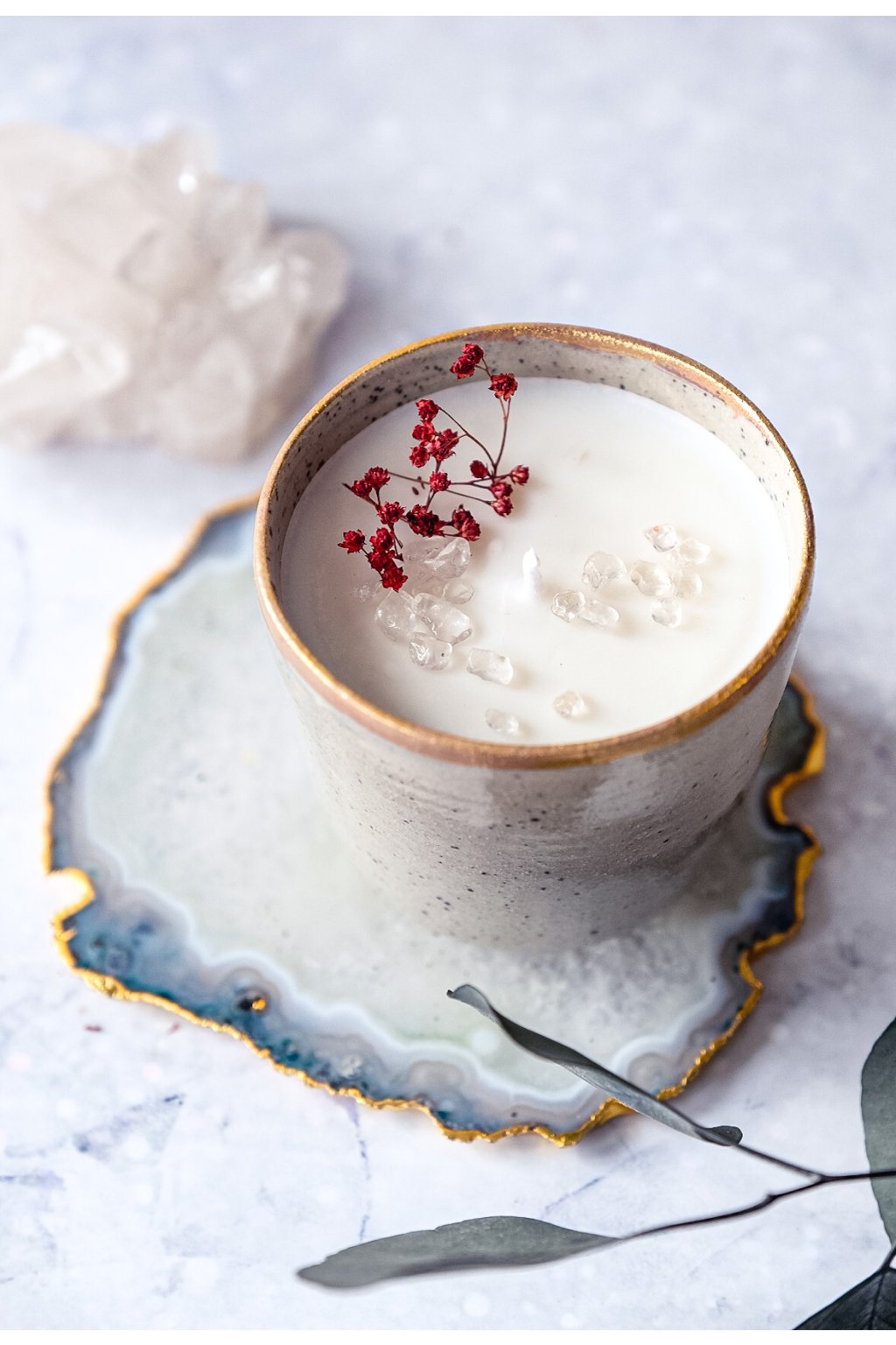 Svíčka je navíc ozdobena jemným drobným křišťálem. Křišťál dokáže pracovat i s energií tak, že ji dokáže dostat do nejdokonalejšího možného stavu a odstranit vzniklou nerovnováhu hodí se také pro meditační účely. Naladí Vás k duchovnímu účelu a dokáže odfiltrovat všechny negativní vlivy.