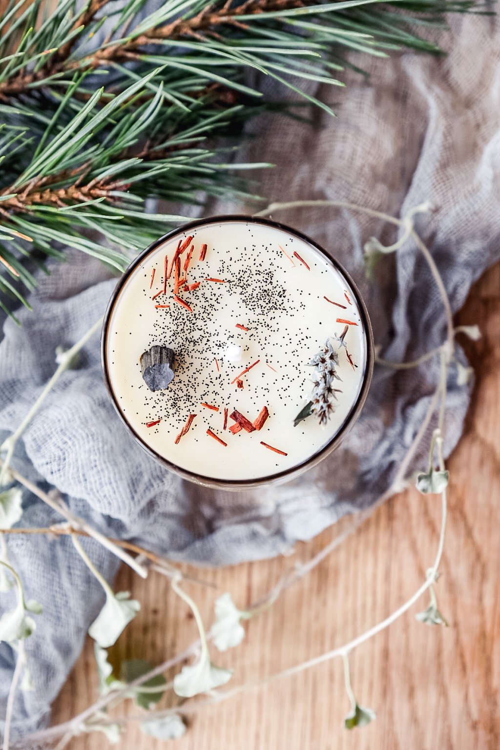 Svíčka je zdobená černým turmalínem, který ochraňuje před negativní energií a posypaná rozložitelnými třpytkami.
