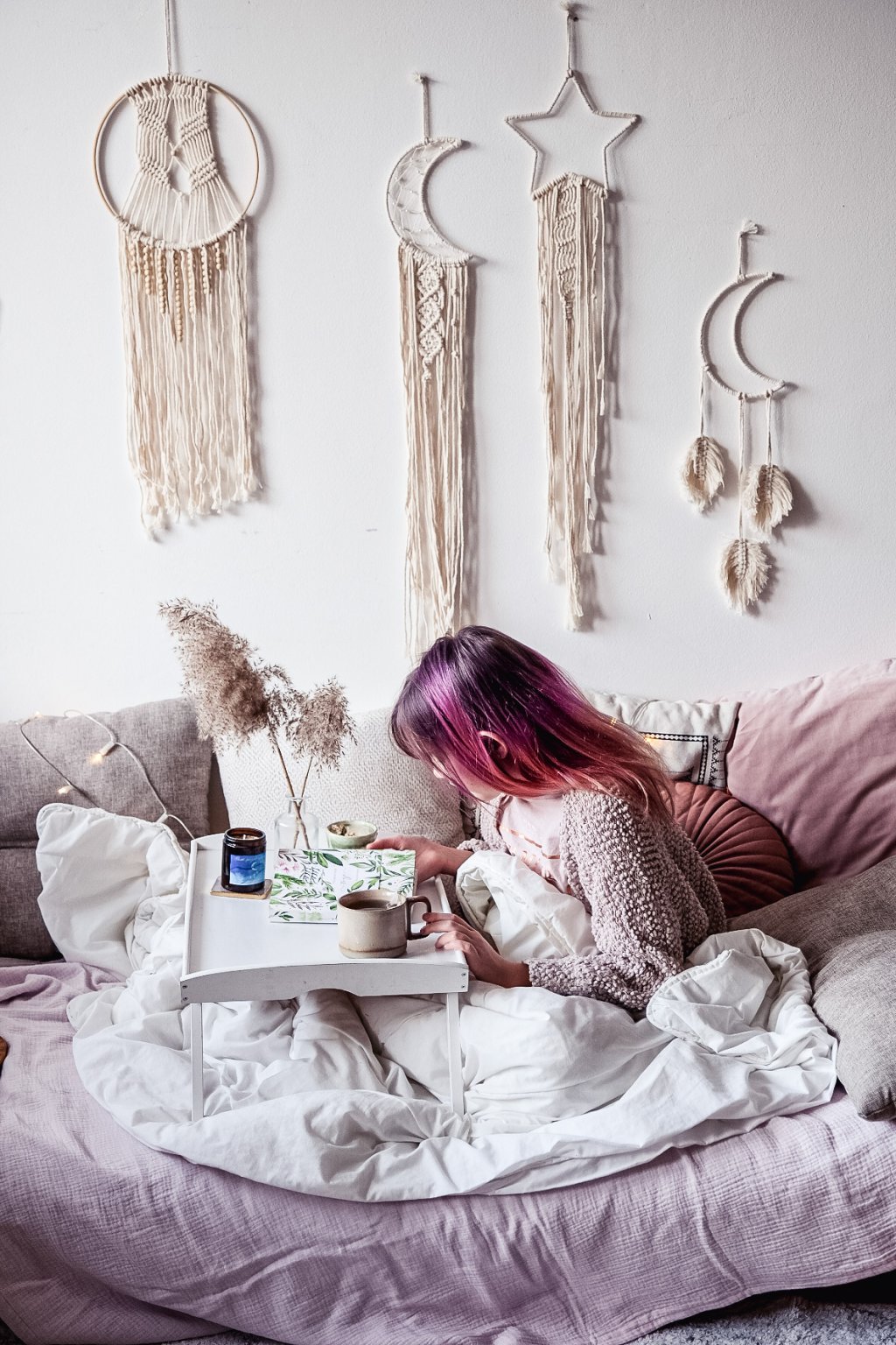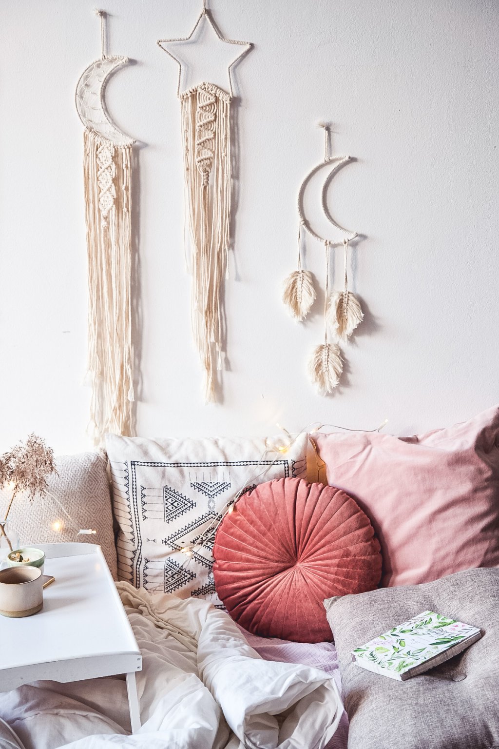 Ručně pletené Macramé s krásným měsíčkem a peříčky je ideální do vaší ložnice. Zútulní každý koutek i stěnu. Přinese Vám sladké sny.