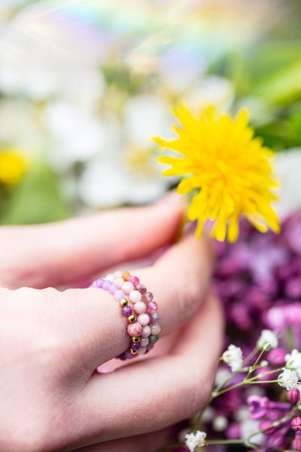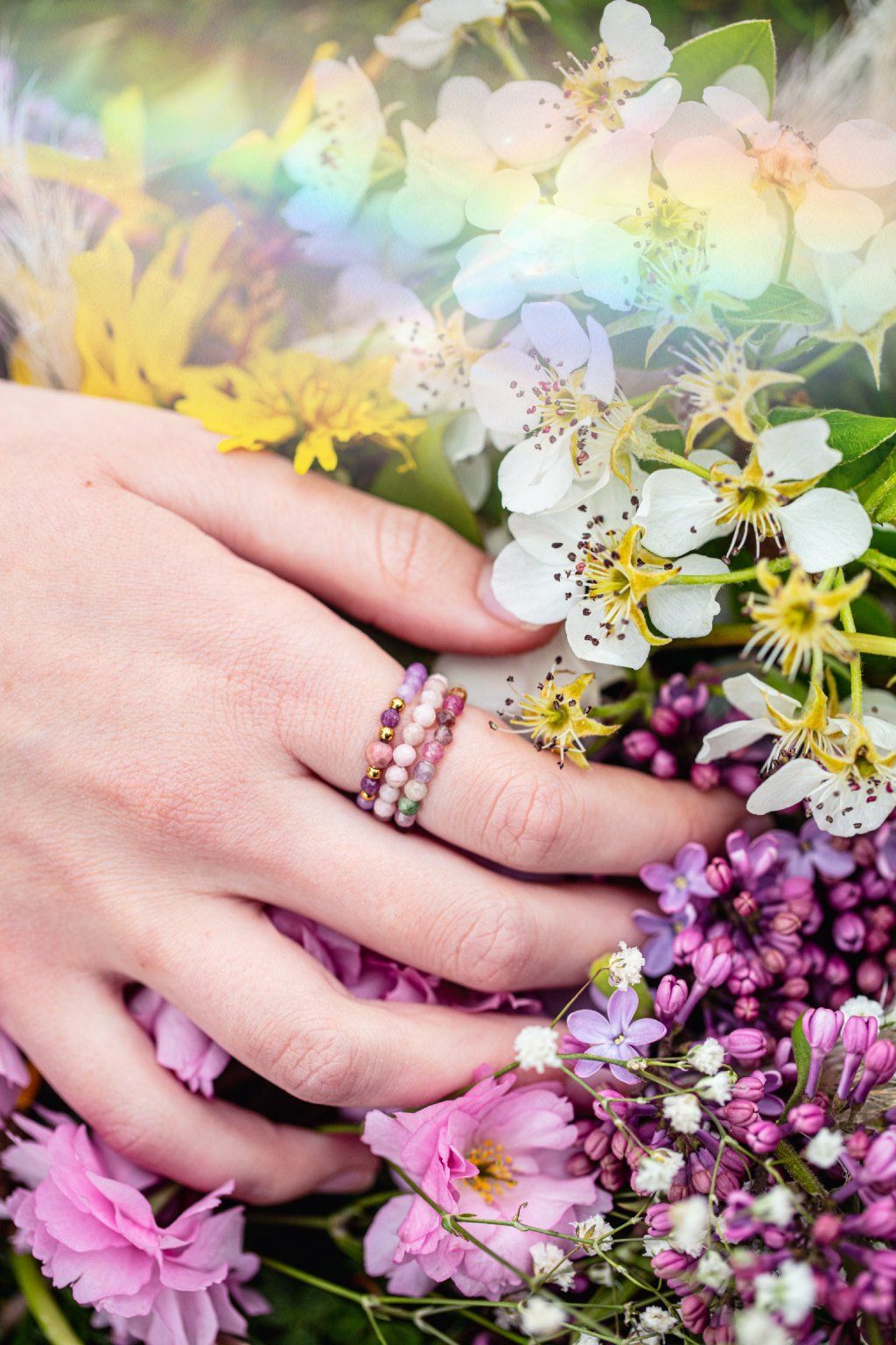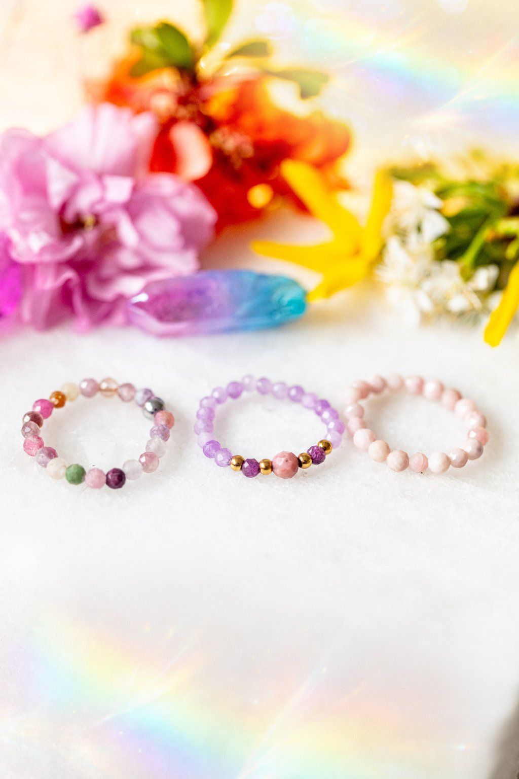 Prsteny jsou složené z korálků, perliček a krystalů: barevný turmalín, rodonit, ametyst