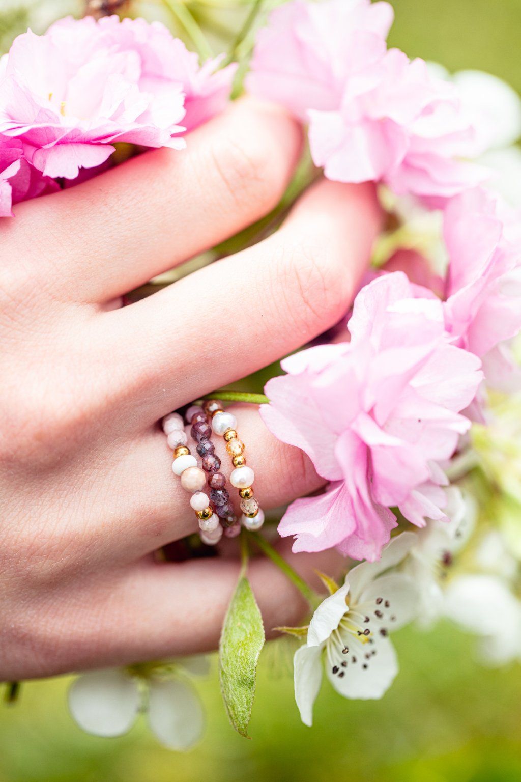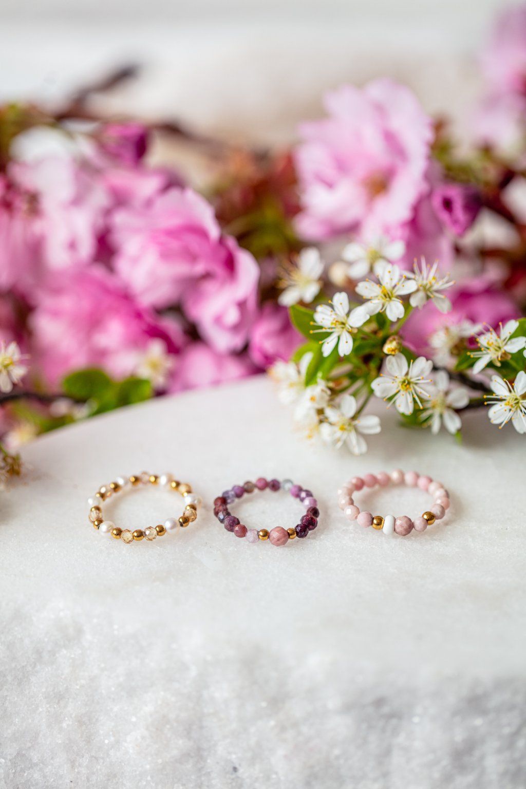 Prsteny jsou složené z korálků, perliček a krystalů: růžový turmalín, rodonit, citrín a říční perly