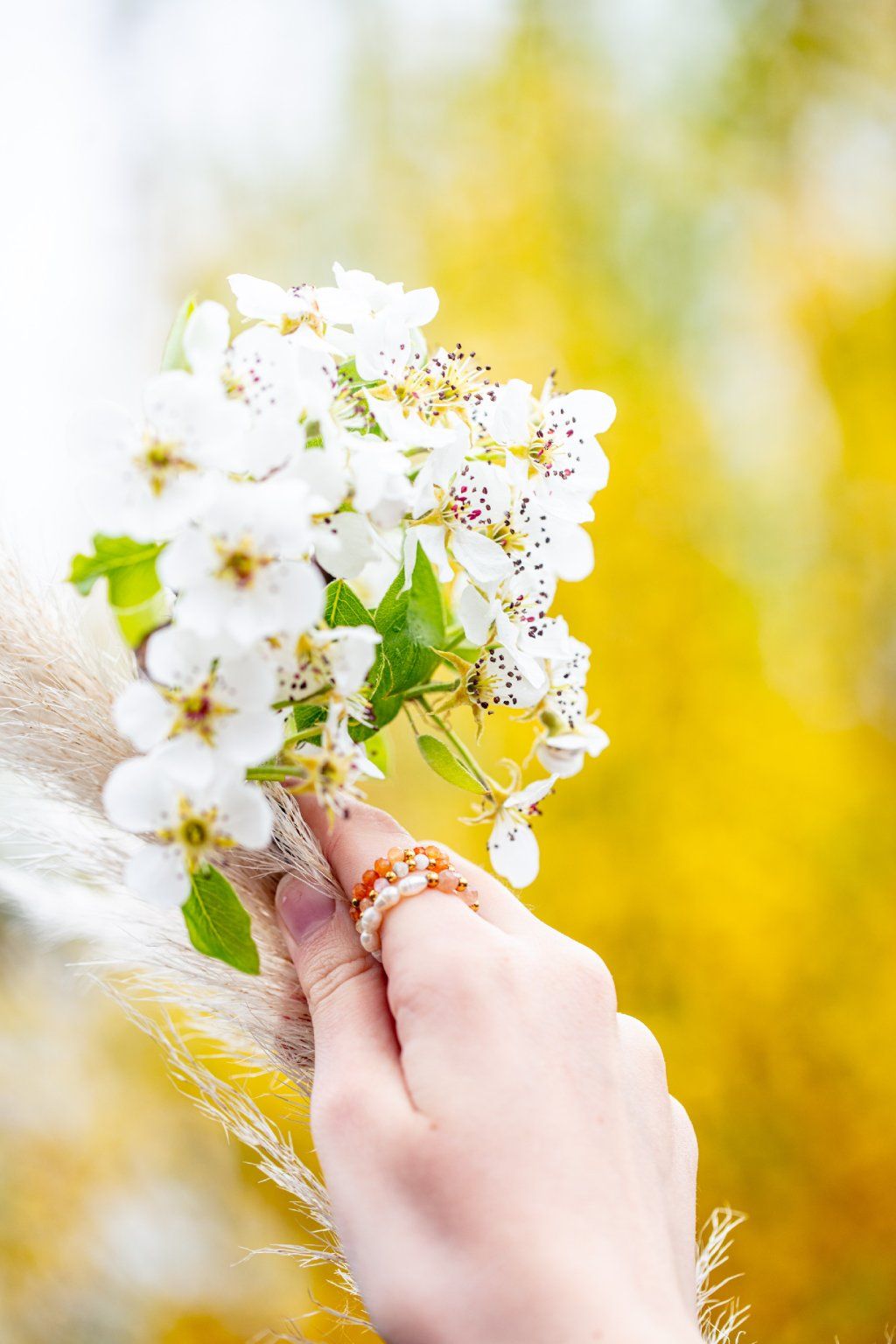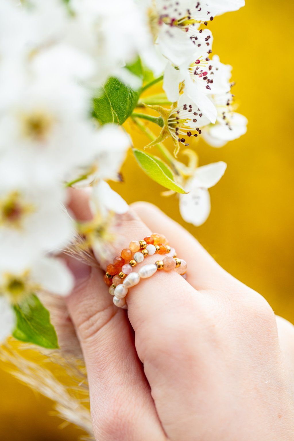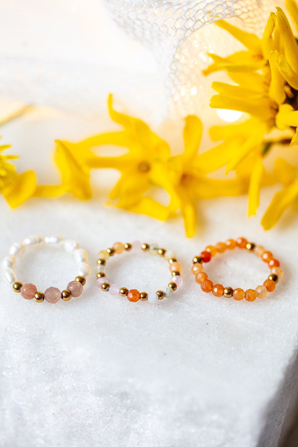 Prsteny jsou složené z korálků, perliček a krystalů: říční perly, růženín, mléčný křišťál a karneol