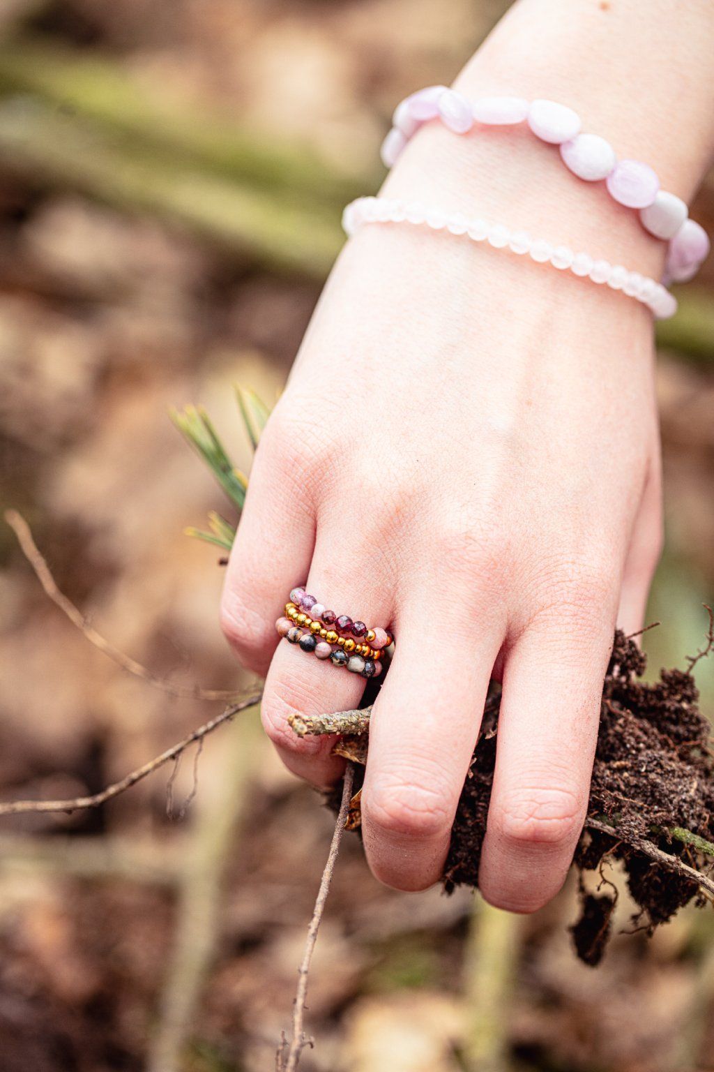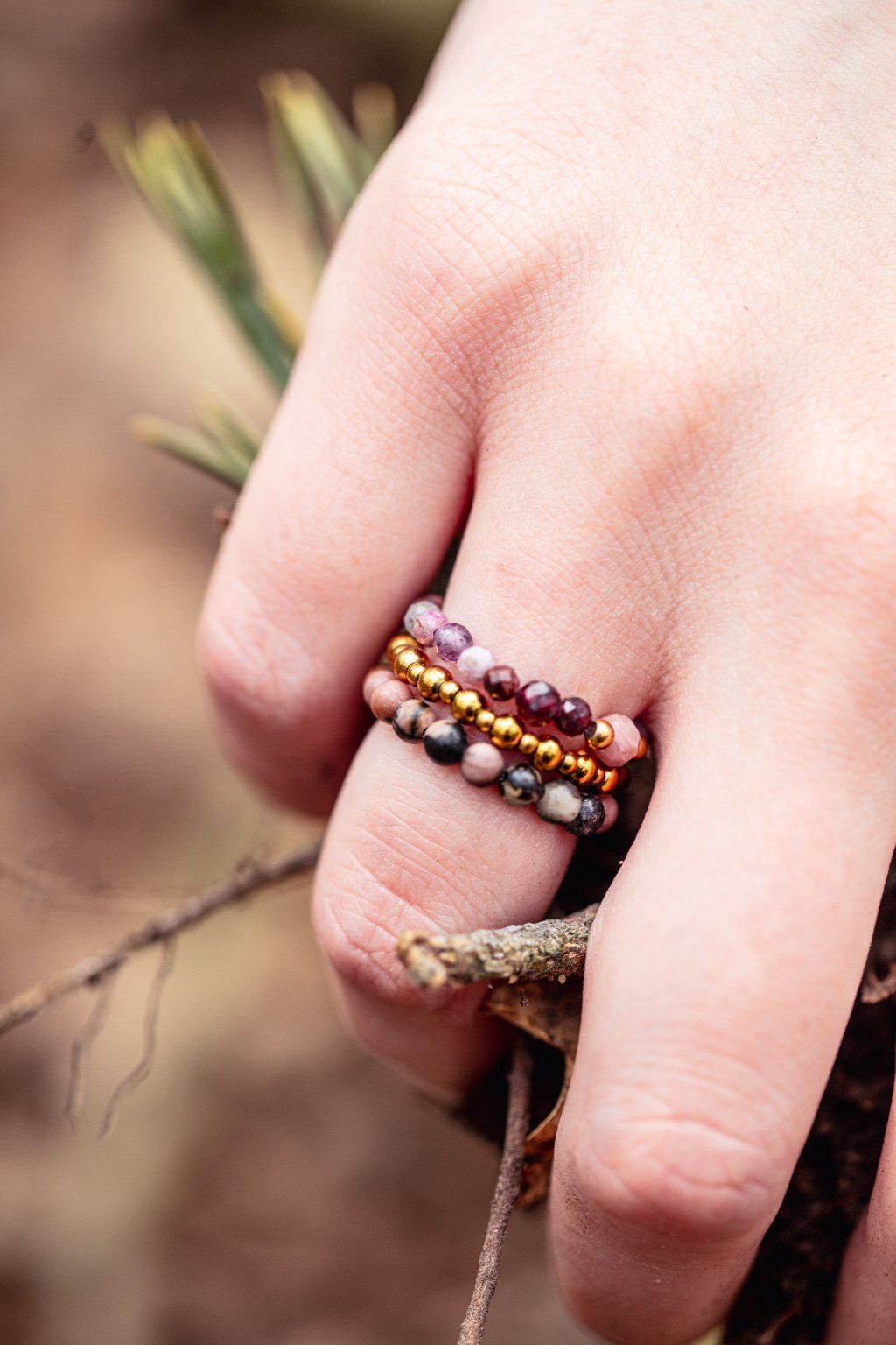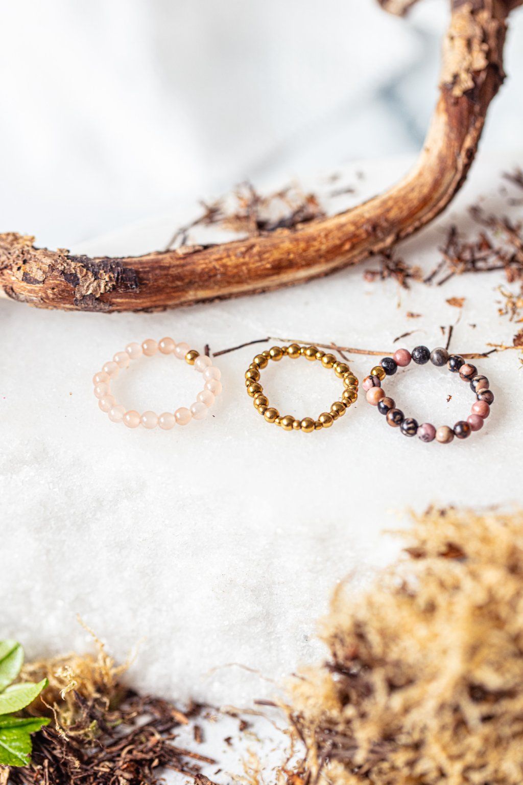 Prsteny jsou složené z korálků, perliček a krystalů: růženín, zlaté korálky a rodochrozit