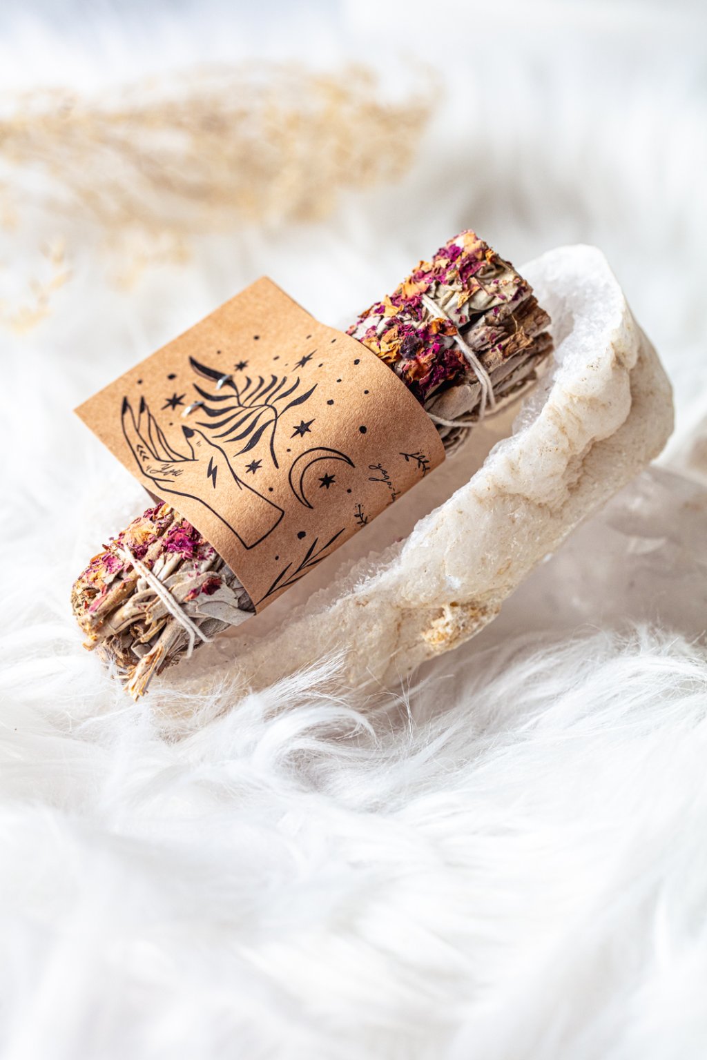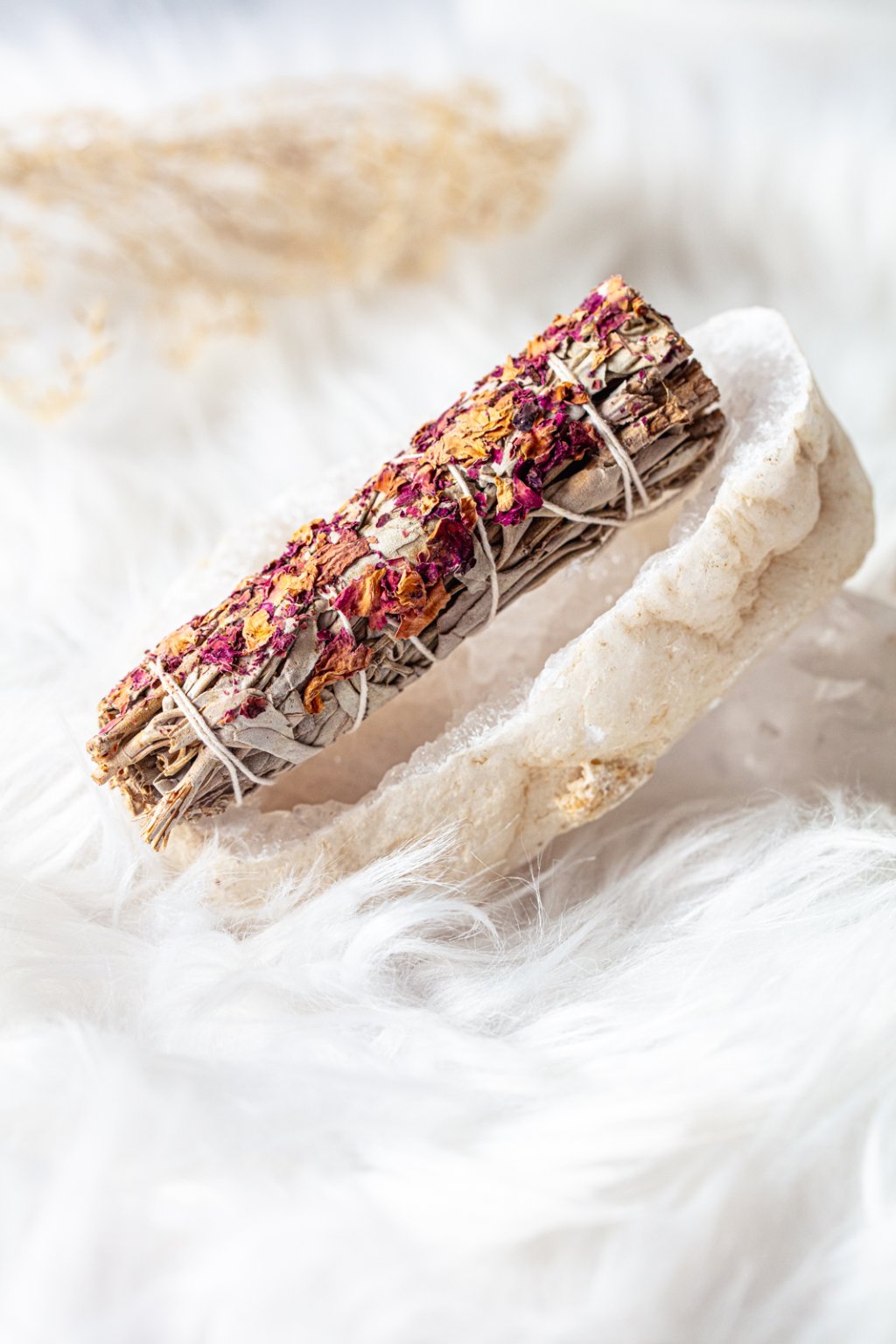 Nádherná šalvěj ozdobená okvětními lístky růže, které z ní dělají nejen praktické vykuřovadlo, ale také nádherný doplněk.