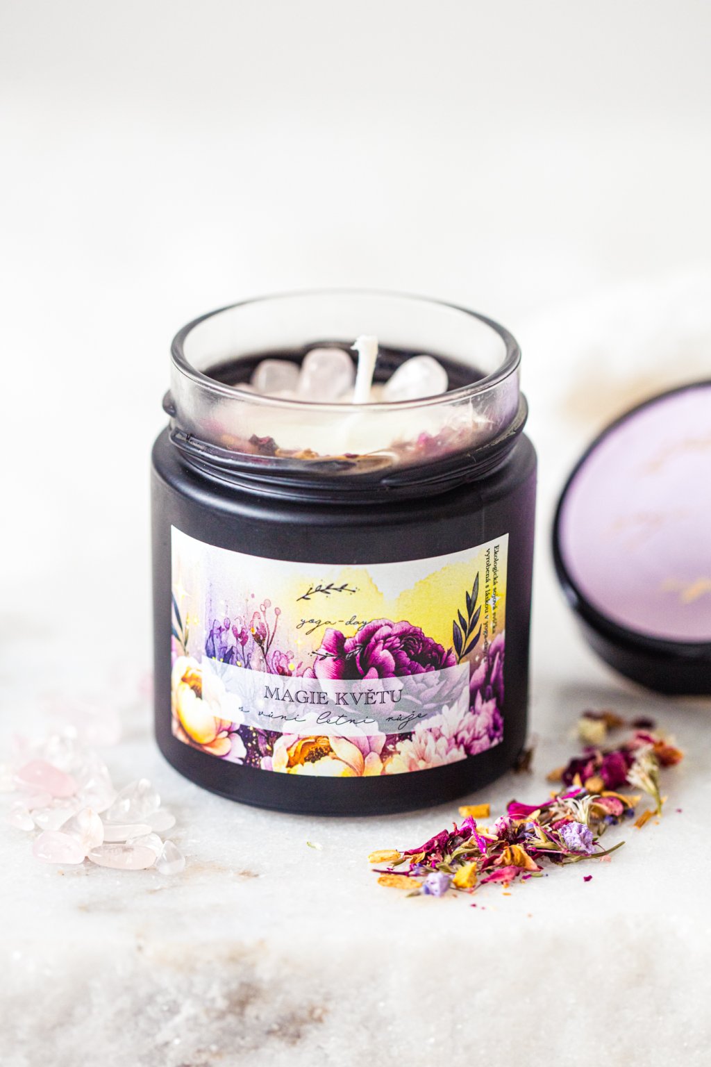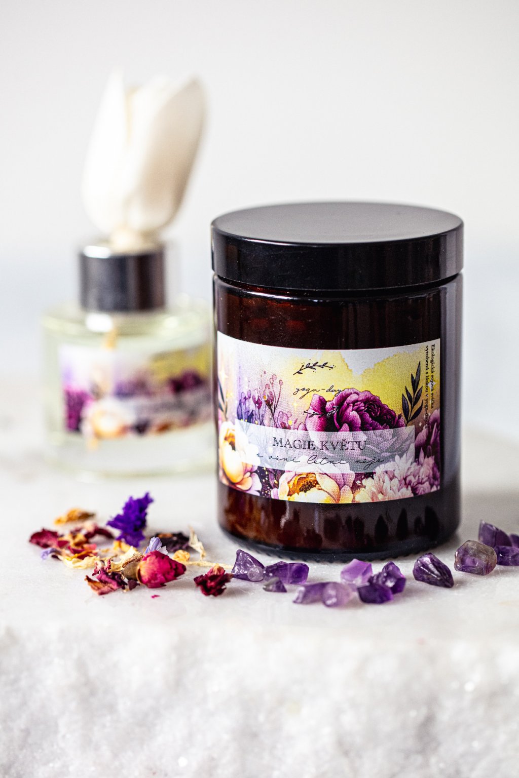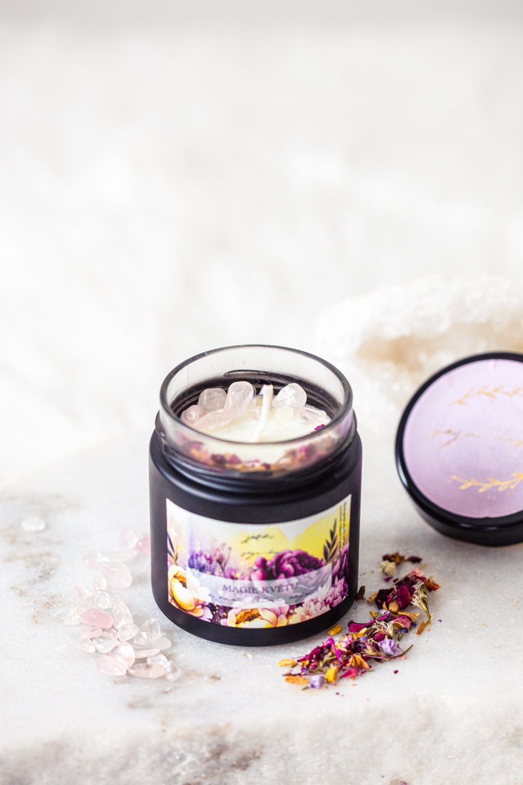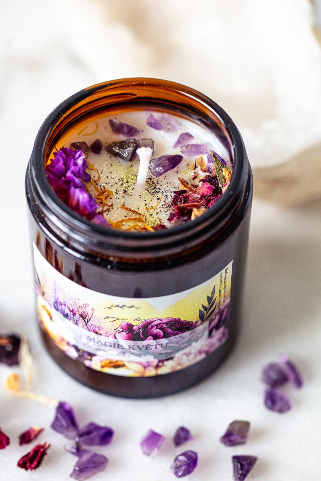 Tu podpoří ametyst, který svíčku zdobí. Ametyst snižuje působení stresu, napomáhá k přijetí nových myšlenek a odstraňuje emoční vyčerpání. Je vhodný pro meditace, při kterých může napomoci rozšířeným stavům vědomí. Umí zvednout náladu, zklidnit mysl a působí proti nespavosti. Pomáhá s překonáním závislostí.
